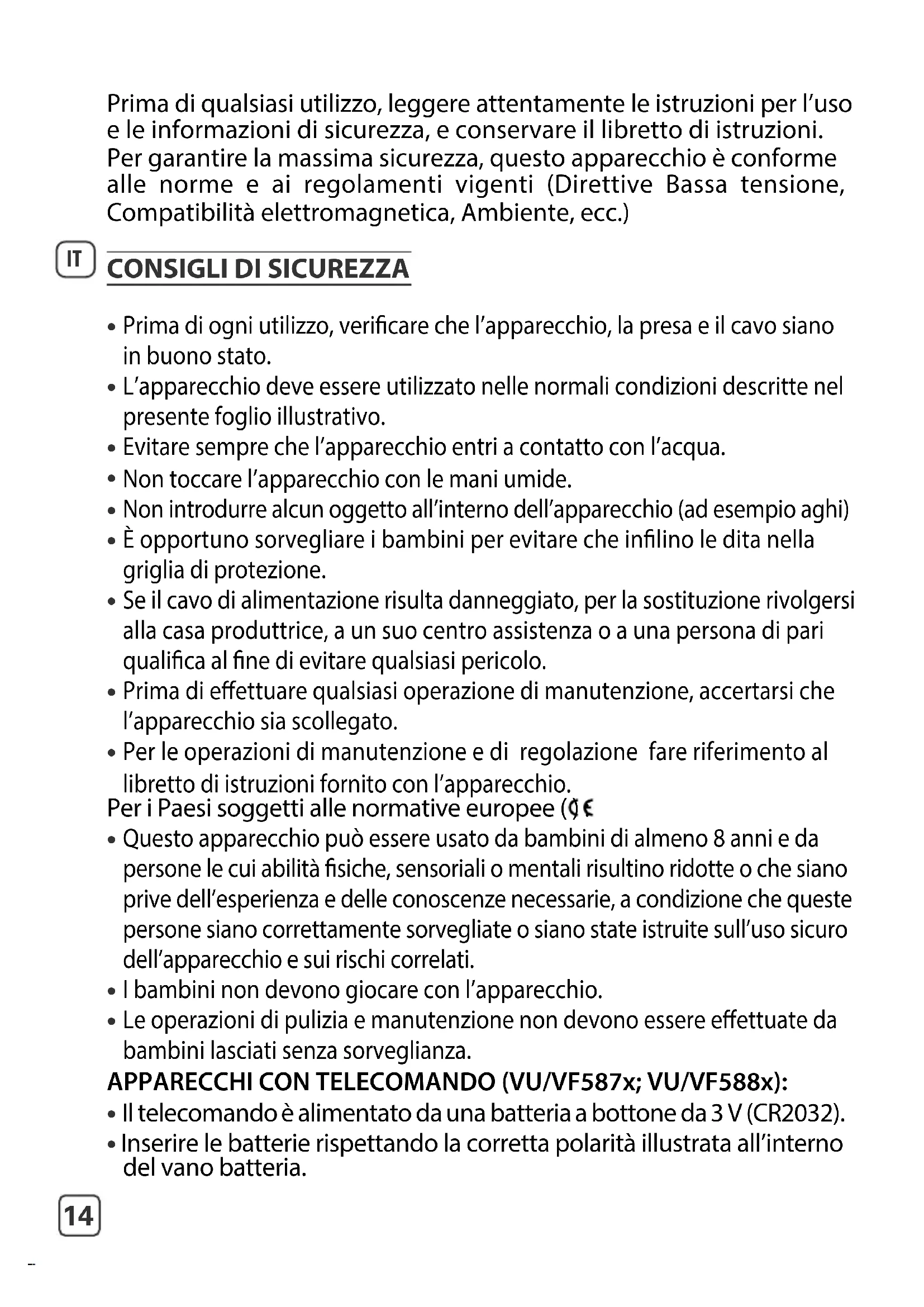 Le operazioni di pulizia e manutenzione non devono essere eettuate da bambini lasciati senza sorveglianza. APPARECCHI CON TELECOMANDO (VU/VF587x; VU/VF588x):