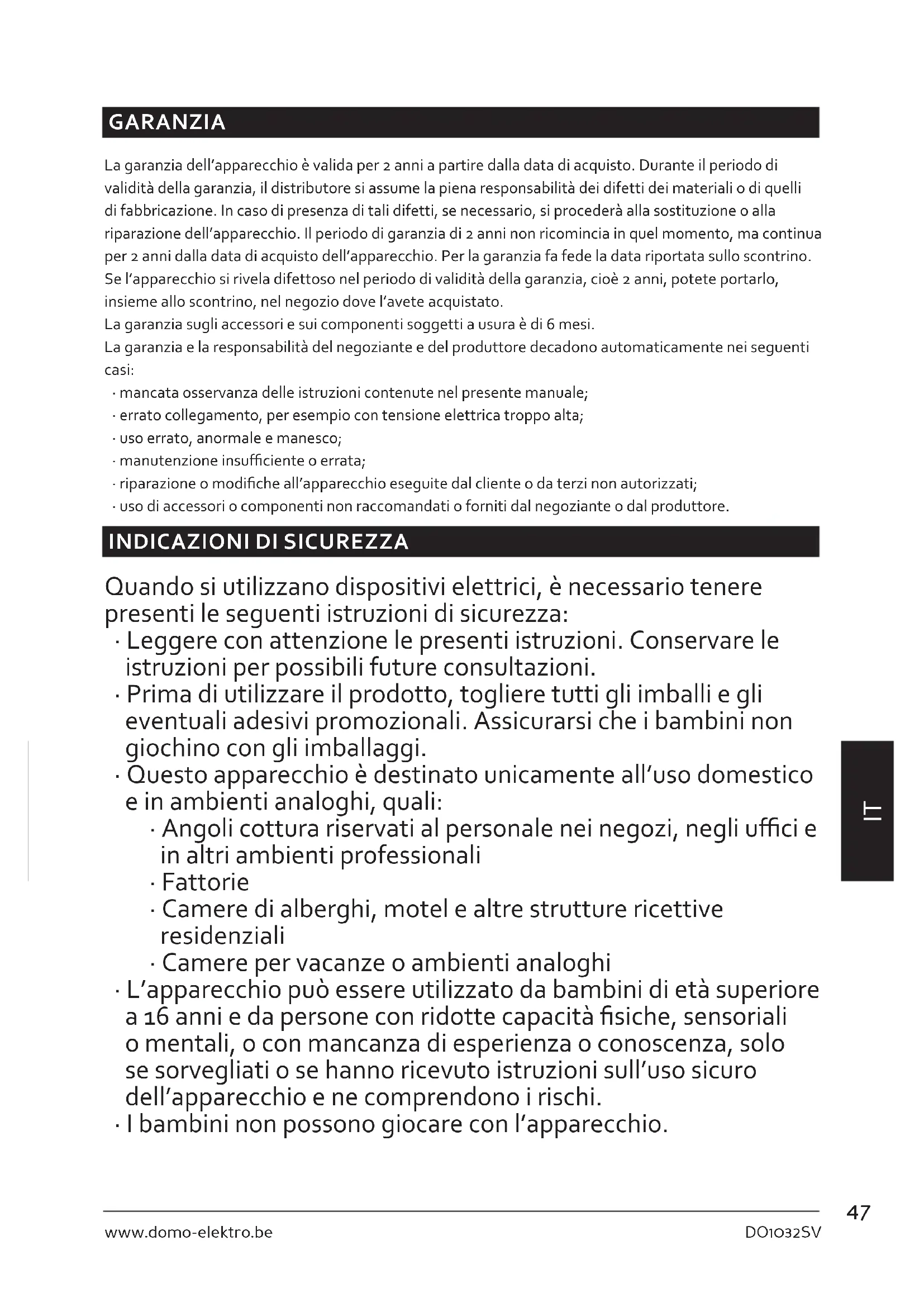 - Srotolare completamente il cavo di alimentazione per evitare che si surriscaldi. Non lasciare mai il cavo di alimentazione penzolante sotto l’apparecchio.49 DO1032SV www.domo-elektro.be