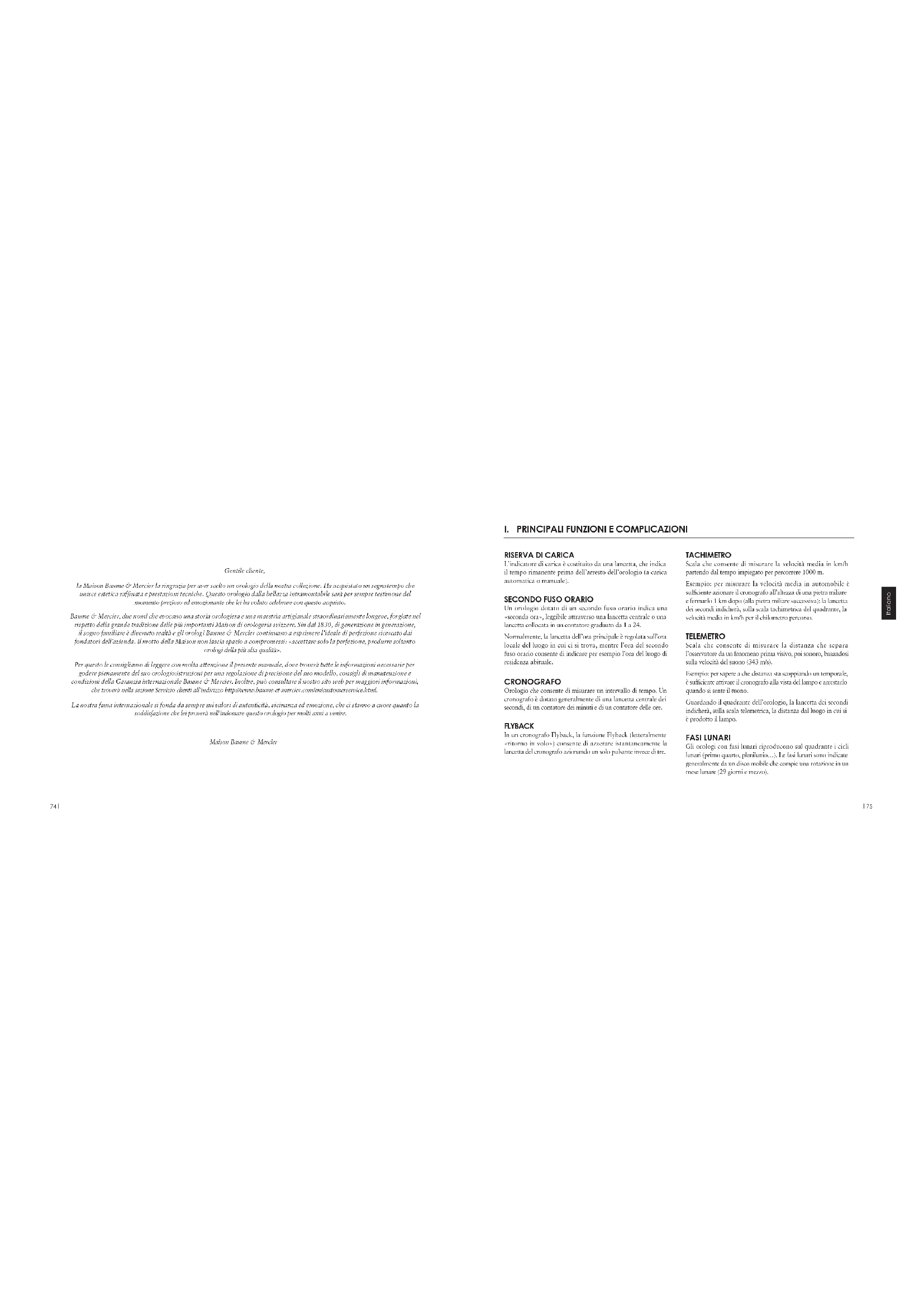 Italiano Gentile cliente, la Maison Baume & Mercier la ringrazia per aver scelto un orologio della nostra collezione. Ha acquistato un segnatempo che unisce estetica rafnata e prestazioni tecniche. Questo orologio dalla bellazza intramontabile sarà per sempre testimone del momento prezioso ed emozionante che lei ha voluto celebrare con questo acquisto. Baume & Mercier, due nomi che evocano una storia orologiera e una maestria artigianale straordinariamente longeve, forgiate nel rispetto della grande tradizione delle più importanti Maison di orologeria svizzere. Sin dal 1830, di generazione in generazione, il sogno familiare è divenuto realtà e gli orologi Baume & Mercier continuano a esprimere l’ideale di perfezione ricercato dai fondatori dell’azienda. Il motto della Maison non lascia spazio a compromessi: «accettare solo la perfezione, produrre soltanto orologi della più alta qualità». Per questo le consigliamo di leggere con molta attenzione il presente manuale, dove troverà tutte le informazioni necessarie per godere pienamente del suo orologio:istruzioni per una regolazione di precisione del suo modello, consigli di manutenzione e condizioni della Garanzia internazionale Baume & Mercier. Inoltre, può consultare il nostro sito web per maggiori informazioni, che troverà nella sezione Servizio clienti all’indirizzo http://www.baume-et-mercier.com/en/customerservice.html. La nostra fama internazionale si fonda da sempre sui valori di autenticità, vicinanza ed emozione, che ci stanno a cuore quanto la soddisfazione che lei proverà nell’indossare questo orologio per molti anni a venire. Maison Baume & Mercier