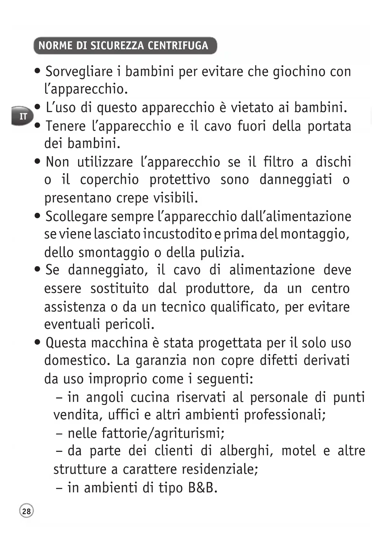 - Questa macchina è stata progettata per il solo uso domestico. La garanzia non copre difetti derivati da uso improprio come i seguenti: – in angoli cucina riservati al personale di punti vendita, uffici e altri ambienti professionali; – nelle fattorie/agriturismi; – da parte dei clienti di alberghi, motel e altre strutture a carattere residenziale; – in ambienti di tipo B&B.29