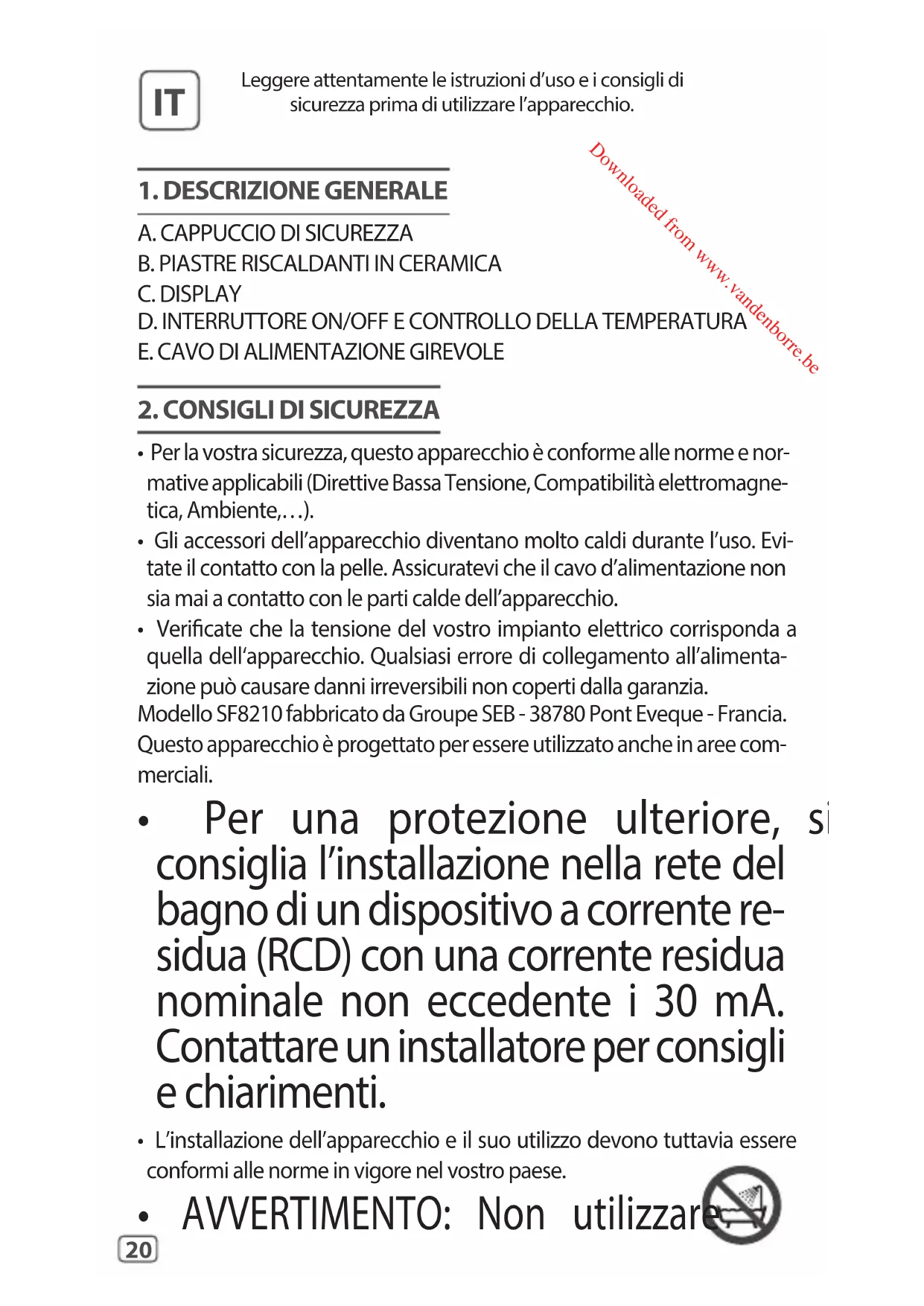 - Vericate che la tensione del vostro impianto elettrico corrisponda a quella dell‘apparecchio. Qualsiasi errore di collegamento all’alimenta- zione può causare danni irreversibili non coperti dalla garanzia. Modello SF8210 fabbricato da Groupe SEB - 38780 Pont Eveque - Francia. Questo apparecchio è progettato per essere utilizzato anche in aree com- merciali.
