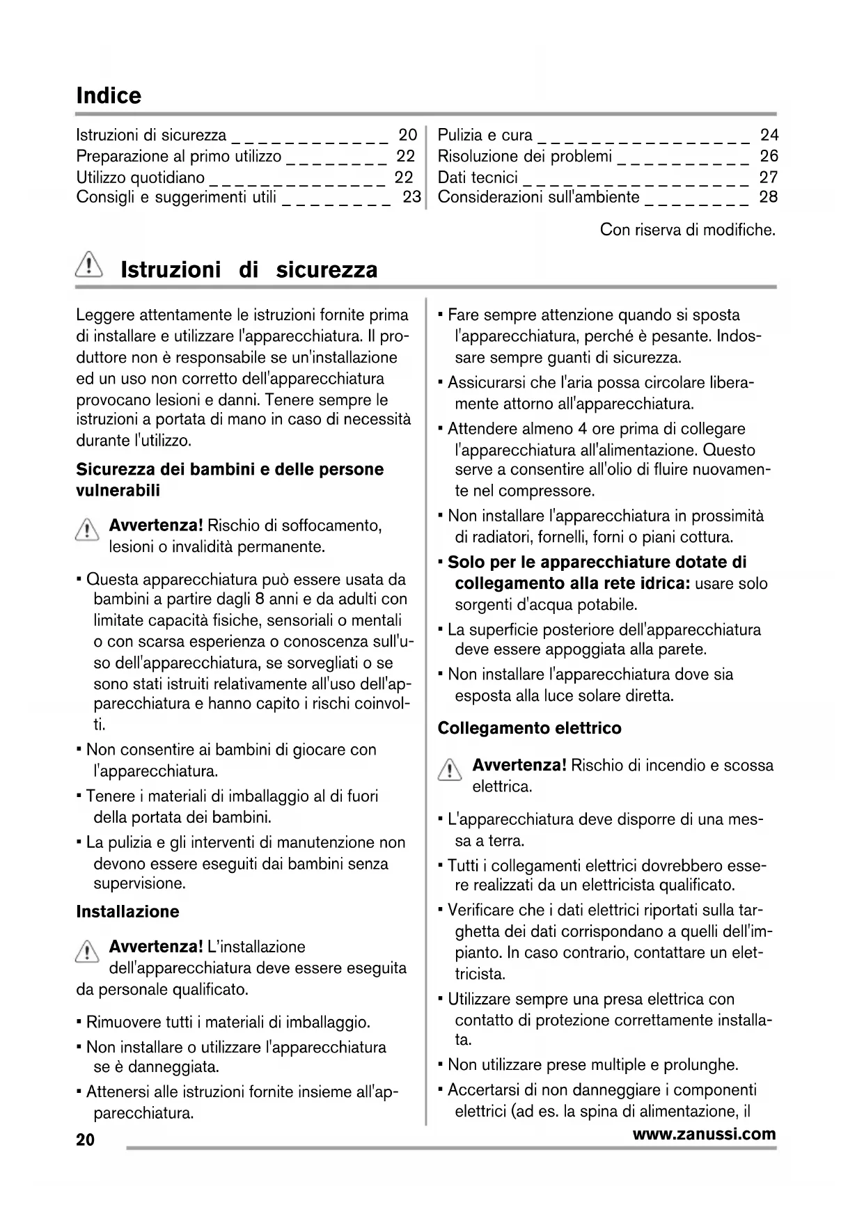 www.zanussi.comIndice Istruzioni di sicurezza _ _ _ _ _ _ _ _ _ _ _ _ 20 Preparazione al primo utilizzo _ _ _ _ _ _ _ _ 22 Utilizzo quotidiano _ _ _ _ _ _ _ _ _ _ _ _ _ _ 22 Consigli e suggerimenti utili _ _ _ _ _ _ _ _ 23 Pulizia e cura _ _ _ _ _ _ _ _ _ _ _ _ _ _ _ _ 24 Risoluzione dei problemi _ _ _ _ _ _ _ _ _ _ 26 Dati tecnici _ _ _ _ _ _ _ _ _ _ _ _ _ _ _ _ _ 27 Considerazioni sull'ambiente _ _ _ _ _ _ _ _ 28 Con riserva di modifiche. Istruzioni di sicurezza Leggere attentamente le istruzioni fornite prima di installare e utilizzare l'apparecchiatura. Il pro- duttore non è responsabile se un'installazione ed un uso non corretto dell'apparecchiatura provocano lesioni e danni. Tenere sempre le istruzioni a portata di mano in caso di necessità durante l'utilizzo. Sicurezza dei bambini e delle persone vulnerabili Avvertenza! Rischio di soffocamento, lesioni o invalidità permanente.