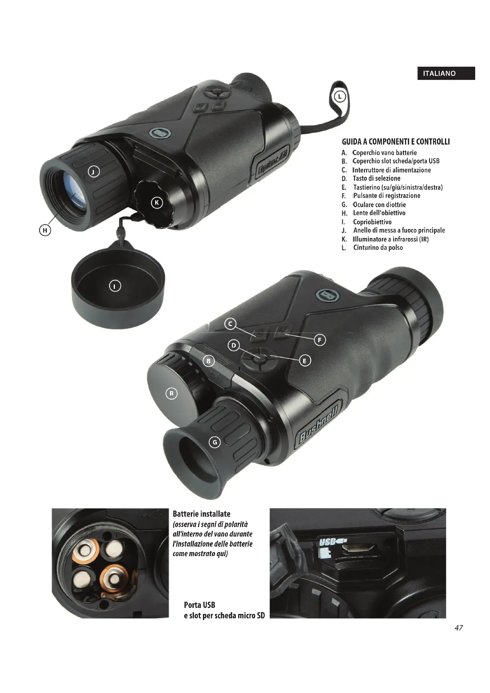 ITALIANO48 INFORMAZIONI SUL VISORE NOTTURNO DIGITALE BUSHNELL® EQUINOX Z2™ Congratulazioni per l'acquisto del visore notturno digitale Bushnell® Equinox Z2™. Composto da elettronica e ottica di alta qualità, Bushnell Equinox Z2 è un maneggevole sistema di visione digitale per la visione notturna che utilizza un sensore CMOS sensibile all'infrarosso, offrendo una risoluzione da punto a punto e una qualità dell'immagine eccezionale. L'ottica completamente multistrato aumenta la trasmissione della luce e riduce il bagliore. I monocoli per la visione notturna digitale Equinox Z2 3x30, 4,5x40 e 6x50 sono abbastanza versatili per molte applicazioni tra cui caccia, campeggio, navigazione/pesca, speleologia, paintball, osservazione delle stelle, salvataggio/recupero, sorveglianza di sicurezza, attività di polizia e registrazione di video con condizioni di luce in continuo cambiamento, dall'alba al buio assoluto. Non solo puoi visualizzare il soggetto di notte, ma puoi anche registrare la sua immagine in formato foto o video, e salvare il tutto su scheda micro SD.