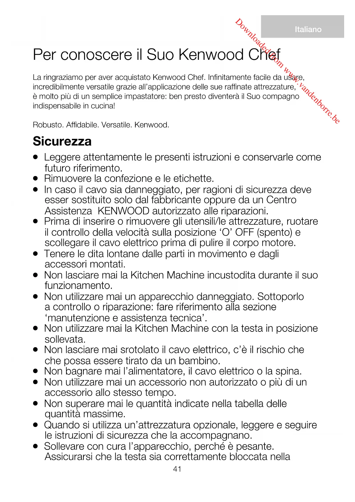 Italiano Per conoscere il Suo Kenwood Chef La ringraziamo per aver acquistato Kenwood Chef. Infinitamente facile da usare, incredibilmente versatile grazie all’applicazione delle sue raffinate attrezzature, è molto più di un semplice impastatore: ben presto diventerà il Suo compagno indispensabile in cucina! Robusto. Affidabile. Versatile. Kenwood. Downloaded from www.vandenborre.beposizione abbassata e che la ciotola, le attrezzature, i coperchi degli attacchi e il cavo elettrico siano bloccati in posizione prima di sollevare la macchina.