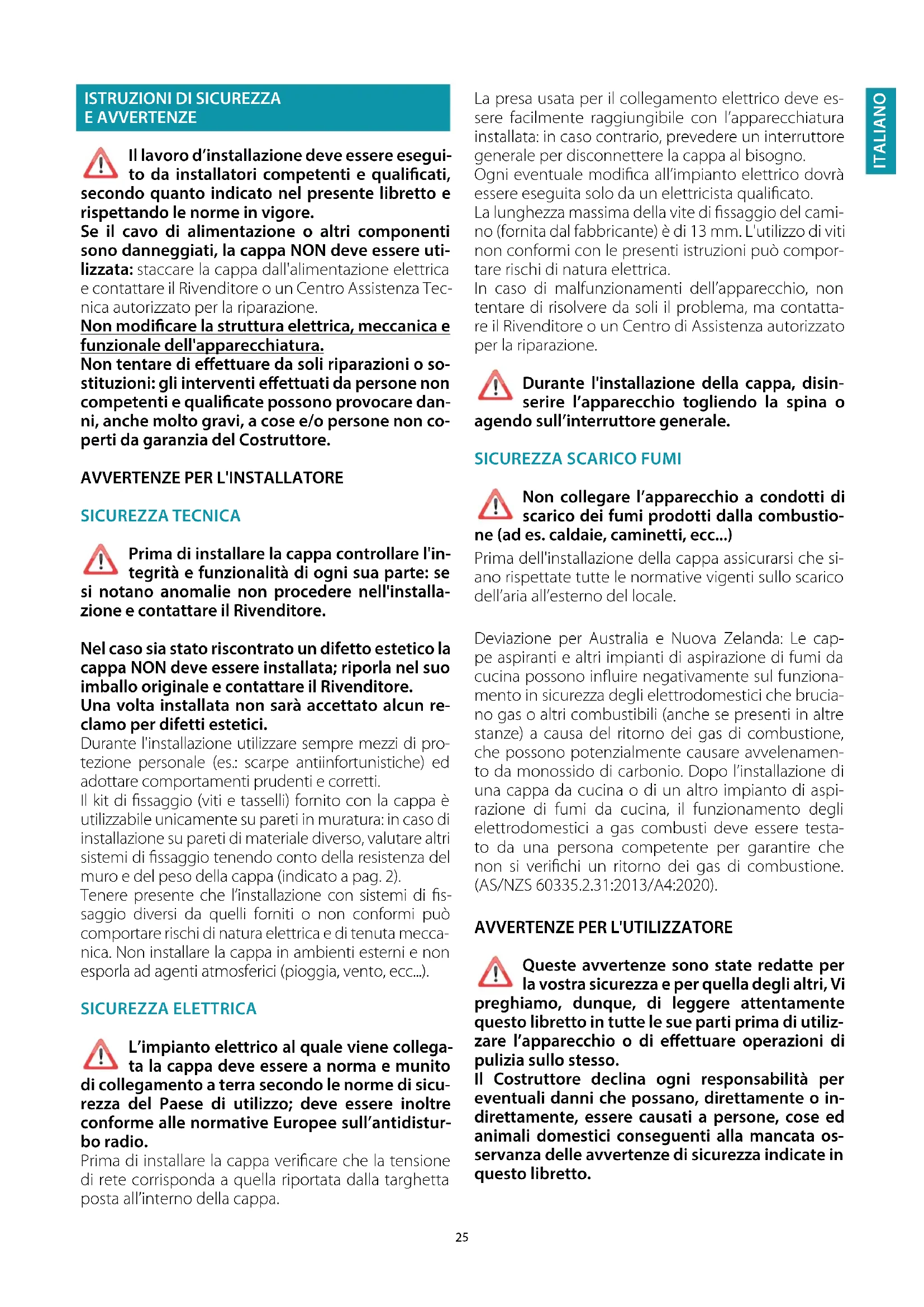 - 2) il negozio al quale viene riconsegnata l’apparecchiatura RAEE deve avere una superficie di vendita superiore a 400 mq. INFORMAZIONI SULLO SMALTIMENTO IN NAZIONI DELL'UNIONE EUROPEA La Direttiva comunitaria sulle apparecchiature RAEE è stata recepita in modo diverso da ciascuna nazione, pertanto se si desidera smaltire questa apparec- chiatura suggeriamo di contattare le autorità locali o il Rivenditore per chiedere il metodo corretto di smaltimento. INFORMAZIONI SULLO SMALTIMENTO IN NAZIONI NON APPARTENENTI ALL'UNIONE EUROPEA Il simbolo del cestino barrato è valido solamente nell’Unione Europea: se si de- sidera smaltire questa apparecchiatura in altri Paesi suggeriamo di contattare le autorità locali o il Rivenditore per chiedere il metodo corretto di smaltimento. ATTENZIONE! Il Costruttore si riserva il diritto di apportare modifiche alle apparecchiature in qualsiasi momento e senza preavviso. La stampa, la traduzione e la riproduzione anche parziale del presente manuale s’intendono vincolate dall’autorizzazione del Costruttore. Le informazioni tecniche, le rappresentazioni grafiche e le specifiche presenti in questo manuale sono indicative e non divulgabili. La lingua di stesura del manuale è l’italiano, il Costruttore non si rende responsa- bile per eventuali errori di trascrizione o traduzione.30 SAFETY INSTRUCTIONS AND WARNINGS Installation operations are to be carried out by skilled and qualied installers in ac- cordance with the instructions in this booklet and in compliance with the regulations in force. DO NOT use the hood if the power supply cable or other components are damaged: disconnect the hood from the electrical power supply and con- tact the Dealer or an authorised Servicing Dealer for repairs. Do not modify the electrical, mechanical or func- tional structure of the equipment. Do not personally try to carry out repairs or re- placements. Interventions carried out by incompe- tent and unauthorised persons can cause serious damage to the unit or physical and personal harm, not covered by the Manufacturer's warranty.