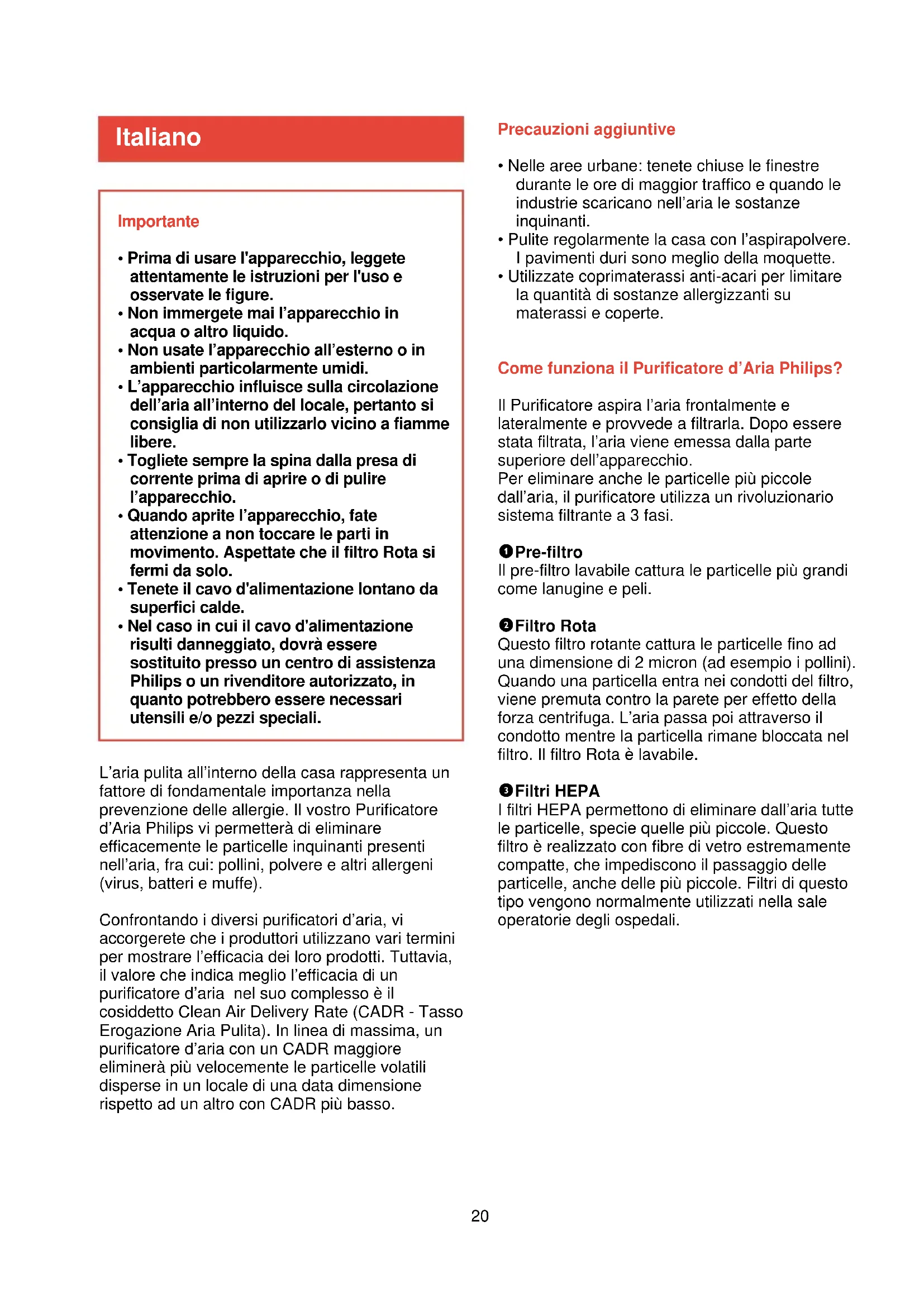 - Utilizzate coprimaterassi anti-acari per limitare la quantità di sostanze allergizzanti su materassi e coperte. Come funziona il Purificatore d’Aria Philips? Il Purificatore aspira l’aria frontalmente e lateralmente e provvede a filtrarla. Dopo essere stata filtrata, l’aria viene emessa dalla parte superiore dell’apparecchio. Per eliminare anche le particelle più piccole dall’aria, il purificatore utilizza un rivoluzionario sistema filtrante a 3 fasi. 1 Pre-filtro Il pre-filtro lavabile cattura le particelle più grandi come lanugine e peli. 2 Filtro Rota Questo filtro rotante cattura le particelle fino ad una dimensione di 2 micron (ad esempio i pollini). Quando una particella entra nei condotti del filtro, viene premuta contro la parete per effetto della forza centrifuga. L’aria passa poi attraverso il condotto mentre la particella rimane bloccata nel filtro. Il filtro Rota è lavabile. 3 Filtri HEPA I filtri HEPA permettono di eliminare dall’aria tutte le particelle, specie quelle più piccole. Questo filtro è realizzato con fibre di vetro estremamente compatte, che impediscono il passaggio delle particelle, anche delle più piccole. Filtri di questo tipo vengono normalmente utilizzati nella sale operatorie degli ospedali. Italiano L’aria pulita all’interno della casa rappresenta un fattore di fondamentale importanza nella prevenzione delle allergie. Il vostro Purificatore d’Aria Philips vi permetterà di eliminare efficacemente le particelle inquinanti presenti nell’aria, fra cui: pollini, polvere e altri allergeni (virus, batteri e muffe). Confrontando i diversi purificatori d’aria, vi accorgerete che i produttori utilizzano vari termini per mostrare l’efficacia dei loro prodotti. Tuttavia, il valore che indica meglio l’efficacia di un purificatore d’aria nel suo complesso è il cosiddetto Clean Air Delivery Rate (CADR - Tasso Erogazione Aria Pulita). In linea di massima, un purificatore d’aria con un CADR maggiore eliminerà più velocemente le particelle volatili disperse in un locale di una data dimensione rispetto ad un altro con CADR più basso.21 Descrizione generale (fig. 1)