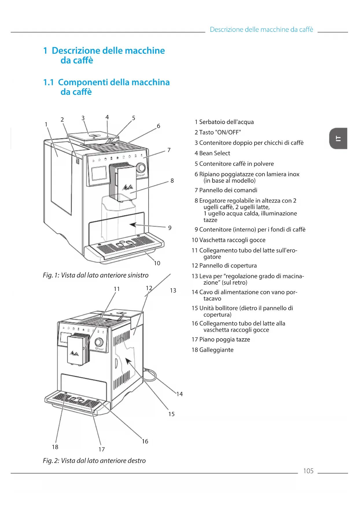 Fig. 2: Vista dal lato anteriore destro 1 Serbatoio dell'acqua 2 Tasto "ON/OFF" 3 Contenitore doppio per chicchi di caè 4 Bean Select 5 Contenitore caè in polvere 6 Ripiano poggiatazze con lamiera inox (in base al modello) 7 Pannello dei comandi 8 Erogatore regolabile in altezza con 2 ugelli caè, 2 ugelli latte, 1 ugello acqua calda, illuminazione tazze 9 Contenitore (interno) per i fondi di caè 10 Vaschetta raccogli gocce 11 Collegamento tubo del latte sull'ero- gatore 12 Pannello di copertura 13 Leva per “regolazione grado di macina- zione” (sul retro) 14 Cavo di alimentazione con vano por- tacavo 15 Unità bollitore (dietro il pannello di copertura) 16 Collegamento tubo del latte alla vaschetta raccogli gocce 17 Piano poggia tazze 18 GalleggianteDescrizione delle macchine da caè