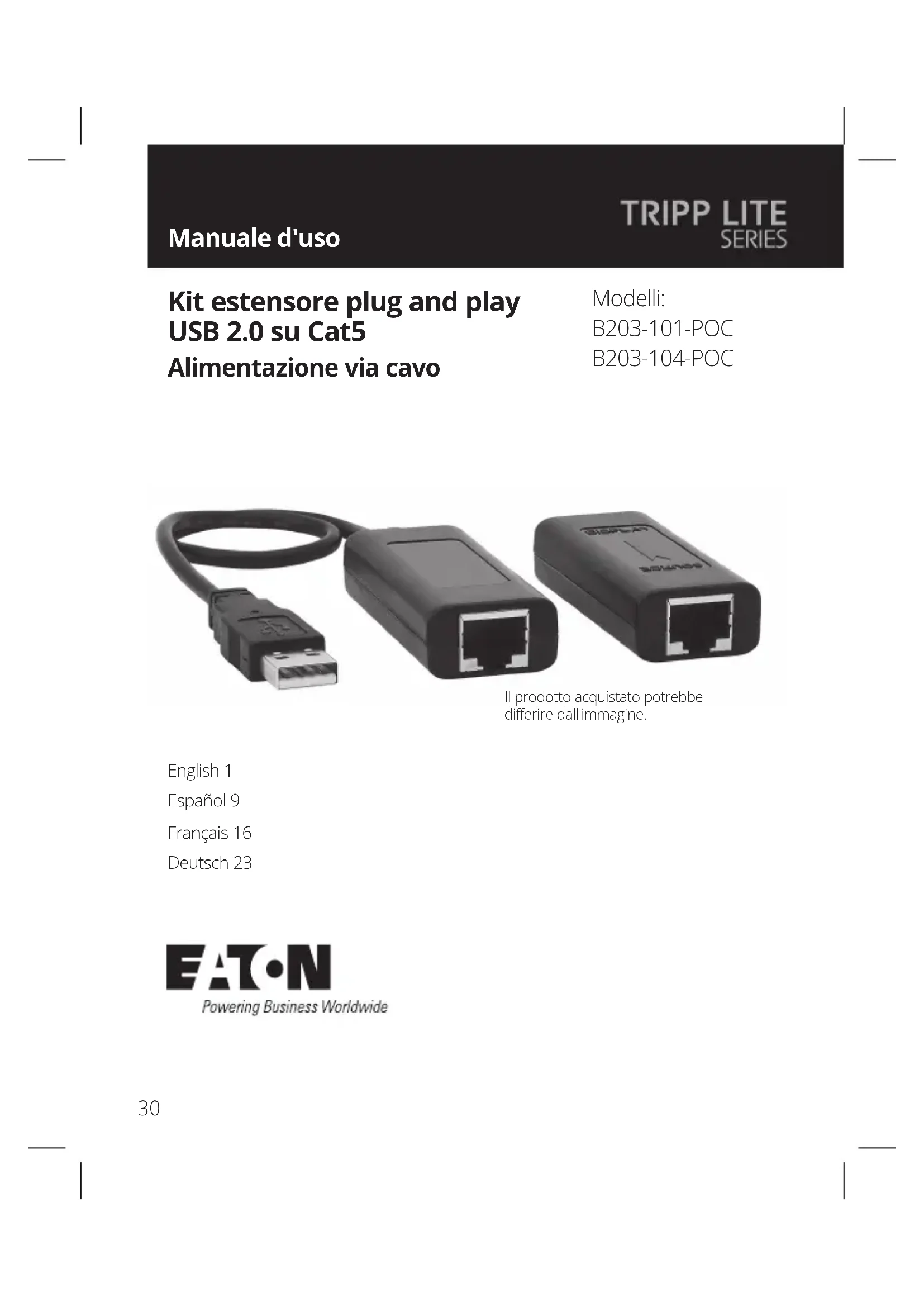 - Quando si collega il ricevitore a dispositivi ad alta potenza, aggiungere l'alimentazione esterna tramite la porta USB Micro-B.34 Speciche Specica B203-101-POC B203-104-POC Versioni USB supportate USB 2.0 (480 Mbps), USB 1.1 (12 Mbps) Porte della trasmittente (x1) RJ45 Porte del ricevitore (x1) RJ45; (x1) USB-A; (x1) USB Micro-B (x1) RJ45; (x4) USB-A; (x1) USB Micro-B Spina della trasmittente USB-A Distanza massima di estensione 164 piedi (50 m) Temperatura di funzionamento da 32 °F a 122 °F (da 0° a 50 °C) Temperatura di conservazione da -4 °F a 158 °F (da -20° a 70 °C) Dimensioni della trasmittente [A x L x P] 0,59 x 14,36 x 1,02 in. (15 x 365 x 26 mm) Dimensioni del ricevitore [A x L x P] 0,59 x 2,36 x 1,02 in. (15 x 60 x 26 mm) 1,95 x 1,00 x 2,42 in. (50 x 26 x 62 mm)35 Garanzia limitata di 1 anno Garantiamo che i nostri prodotti sono privi di difetti dei materiali e di fabbricazione per un periodo di un (1) anno dalla data di acquisto iniziale. I nostri obblighi ai sensi della presente garanzia sono limitati alla riparazione o sostituzione (a nostra esclusiva discrezione) di eventuali prodotti che presentino tali difetti. Prima di inviare un prodotto per la riparazione, visitare Tripplite.Eaton.com/support/product-returns. La presente garanzia non si applica alle unità danneggiate accidentalmente, a causa di negligenza o di un'errata applicazione, o che siano state in qualsiasi modo alterate o modicate. SALVO QUANTO QUI PREDISPOSTO, NON FORNIAMO ALCUNA GARANZIA, ESPLICITA O IMPLICITA, INCLUSE LE GARANZIE DI COMMERCIABILITÀ E IDONEITÀ PER UN PARTICOLARE SCOPO. In alcuni Stati non sono consentite la limitazione o l'esclusione di garanzie implicite; pertanto, in tali casi, le limitazioni o esclusioni di cui sopra potrebbero non applicarsi all'acquirente. SALVO QUANTO PREVISTO SOPRA, IN NESSUN CASO SAREMO RESPONSABILI DI DANNI DIRETTI, INDIRETTI, SPECIALI, INCIDENTALI O