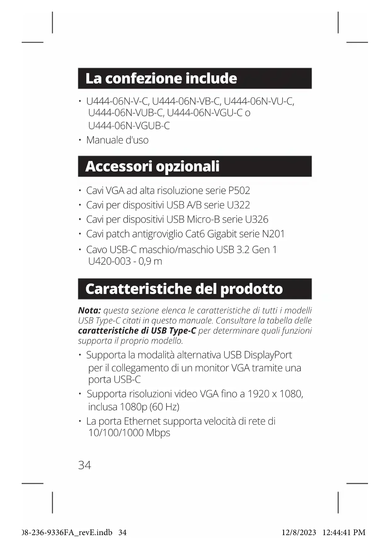 utilizzando un cavo UTP (come i cavi Cat6 della serie N201).** *La porta USB-C per i modelli U444-06N-VU-C e U444-06N-VUB-C supporta sia il trasferimento dati che la ricarica. **Vedere la tabella delle caratteristiche di USB Type-C per le caratteristiche supportate dal prodotto. 23-08-236-9336FA_revE.indb 3623-08-236-9336FA_revE.indb 36 12/8/2023 12:44:41 PM12/8/2023 12:44:41 PM37 Modelli U444-06N-V-C/ U444-06N-VB-C U444-06N-VU-C/