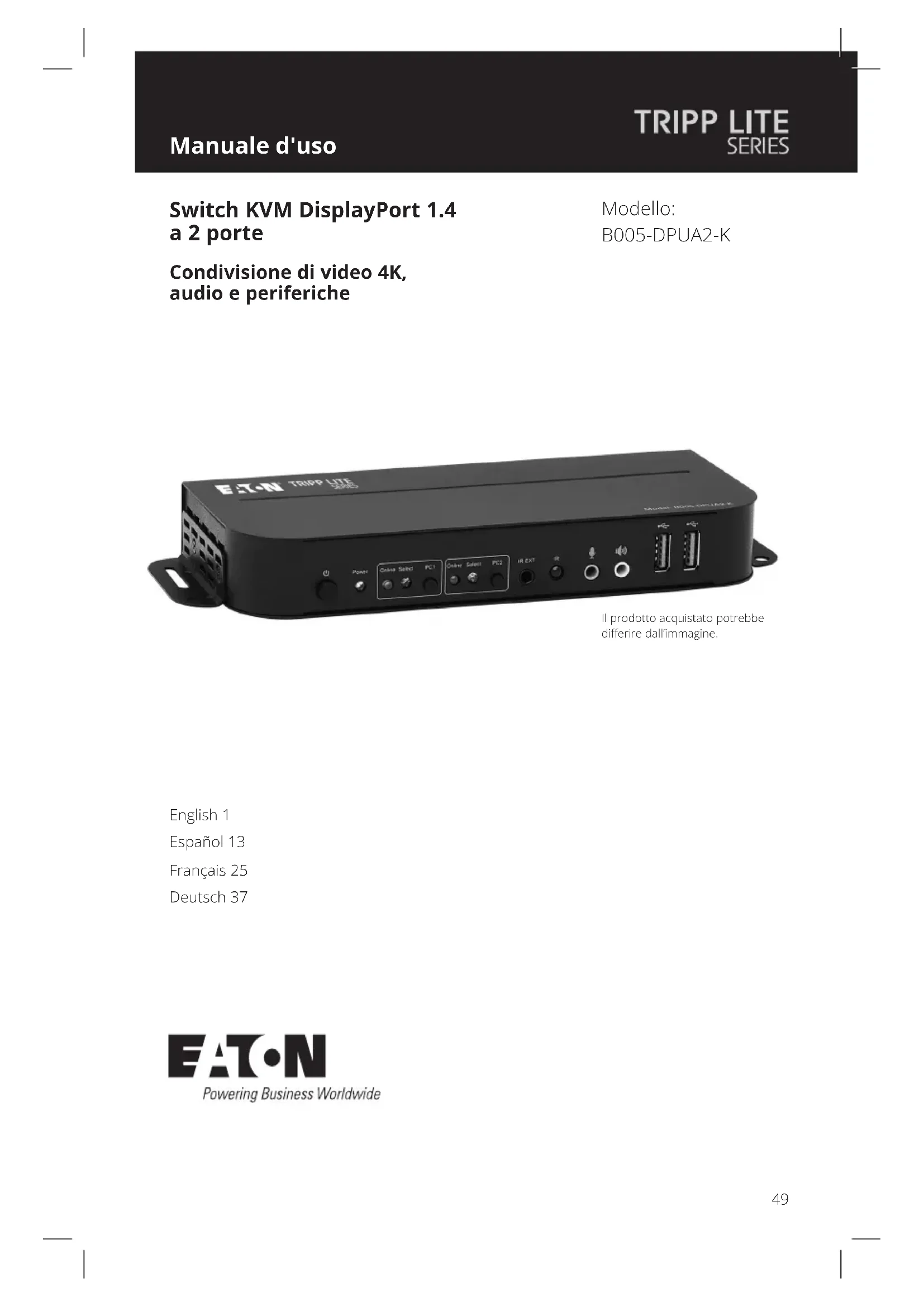 Switch KVM DisplayPort 1.4 a 2 porte Condivisione di video 4K, audio e periferiche Spagnolo 13 Français XX РусскийXX Deutsch XX Italiano XX Il prodotto acquistato potrebbe differire dall’immagine. English 1 Español 13 Français 25 Deutsch 3750
