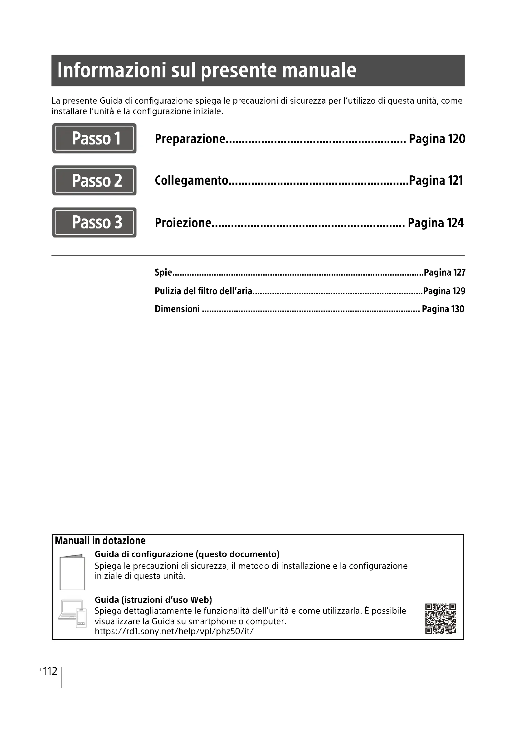 La presente Guida di configurazione spiega le precauzioni di sicurezza per l’utilizzo di questa unità, come installare l’unità e la configurazione iniziale. Informazioni sul presente manuale Preparazione........................................................ Pagina 120 Collegamento........................................................Pagina 121 Proiezione............................................................ Pagina 124 Spie.......................................................................................................Pagina 127 Pulizia del filtro dell’aria......................................................................Pagina 129 Dimensioni .......................................................................................... Pagina 130 Passo 1 Passo 2 Passo 3 Manuali in dotazione Guida di configurazione (questo documento)Spiega le precauzioni di sicurezza, il metodo di installazione e la configurazione iniziale di questa unità.Guida (istruzioni d’uso Web)Spiega dettagliatamente le funzionalità dell’unità e come utilizzarla. È possibile visualizzare la Guida su smartphone o computer.https://rd1.sony.net/help/vpl/phz50/it/113