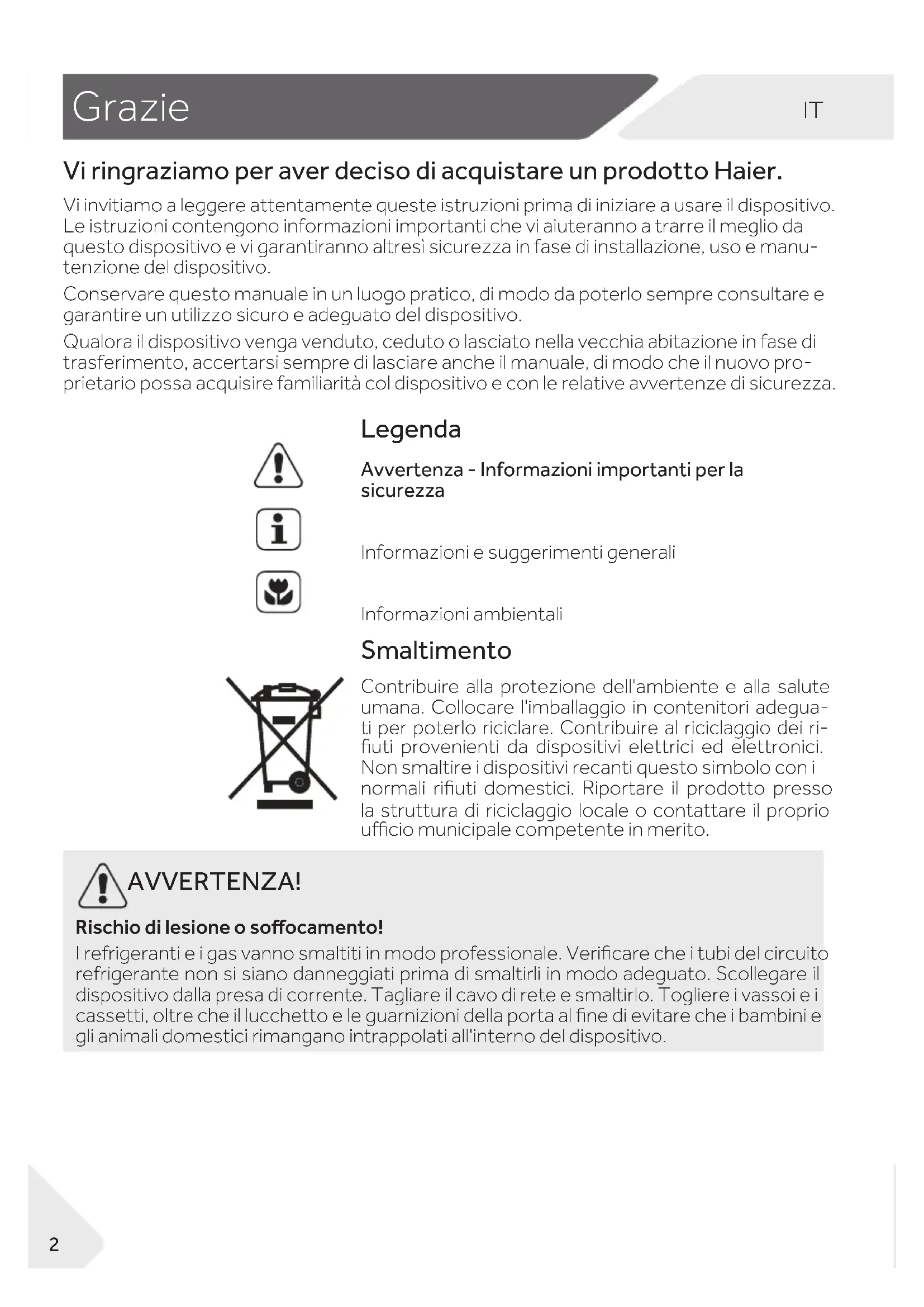 Legenda Avvertenza - Informazioni importanti per la sicurezza Informazioni e suggerimenti generali Informazioni ambientali Smaltimento Contribuire alla protezione dell'ambiente e alla salute umana. Collocare l'imballaggio in contenitori adegua- ti per poterlo riciclare. Contribuire al riciclaggio dei ri- uti provenienti da dispositivi elettrici ed elettronici. Non smaltire i dispositivi recanti questo simbolo con i normali riuti domestici. Riportare il prodotto presso la struttura di riciclaggio locale o contattare il proprio ucio municipale competente in merito. Vi ringraziamo per aver deciso di acquistare un prodotto Haier. Vi invitiamo a leggere attentamente queste istruzioni prima di iniziare a usare il dispositivo. Le istruzioni contengono informazioni importanti che vi aiuteranno a trarre il meglio da questo dispositivo e vi garantiranno altresì sicurezza in fase di installazione, uso e manu- tenzione del dispositivo. Conservare questo manuale in un luogo pratico, di modo da poterlo sempre consultare e garantire un utilizzo sicuro e adeguato del dispositivo. Qualora il dispositivo venga venduto, ceduto o lasciato nella vecchia abitazione in fase di trasferimento, accertarsi sempre di lasciare anche il manuale, di modo che il nuovo pro- prietario possa acquisire familiarità col dispositivo e con le relative avvertenze di sicurezza. AVVERTENZA! Rischio di lesione o soocamento! I refrigeranti e i gas vanno smaltiti in modo professionale. Vericare che i tubi del circuito refrigerante non si siano danneggiati prima di smaltirli in modo adeguato. Scollegare il dispositivo dalla presa di corrente. Tagliare il cavo di rete e smaltirlo. Togliere i vassoi e i cassetti, oltre che il lucchetto e le guarnizioni della porta al ne di evitare che i bambini e gli animali domestici rimangano intrappolati all'interno del dispositivo.