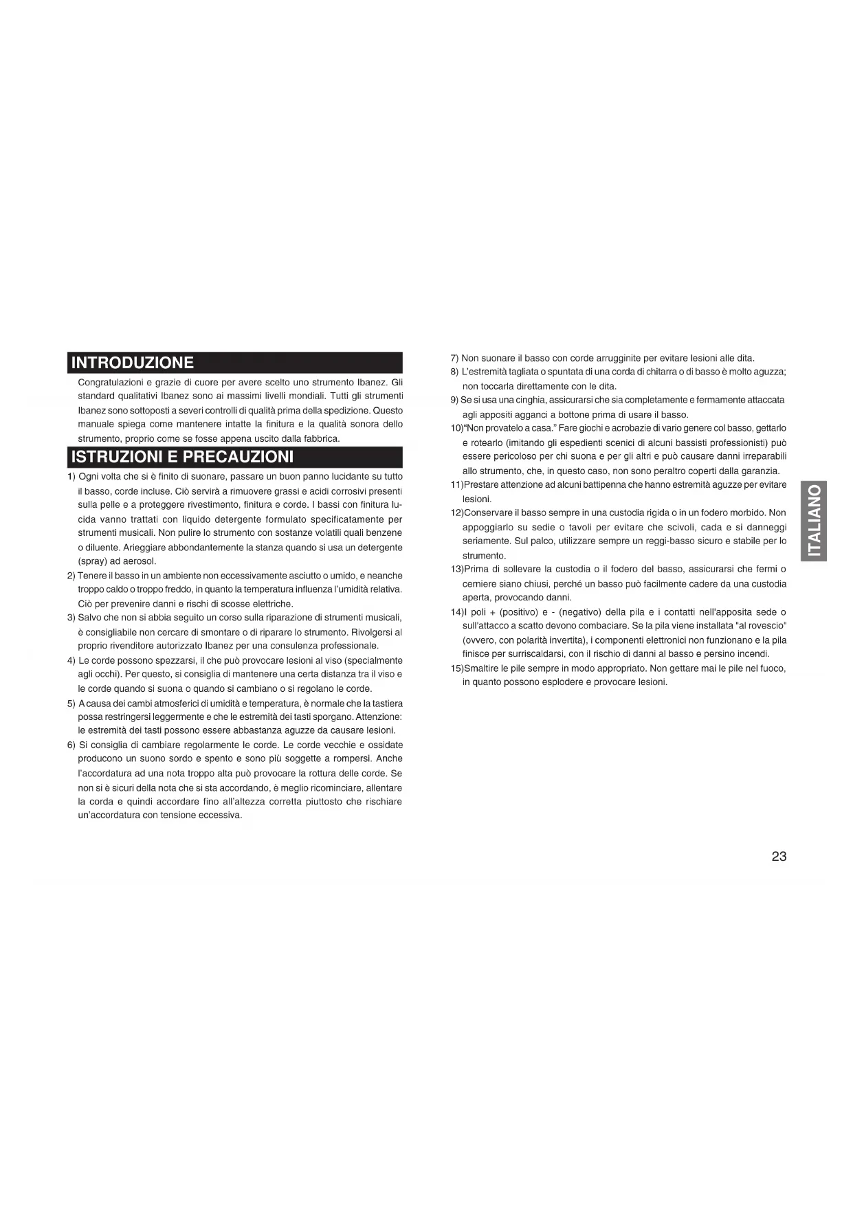 agli appositi agganci a bottone prima di usare il basso. 10)“Non provatelo a casa.” Fare giochi e acrobazie di vario genere col basso, gettarlo e rotearlo (imitando gli espedienti scenici di alcuni bassisti professionisti) può essere pericoloso per chi suona e per gli altri e può causare danni irreparabili allo strumento, che, in questo caso, non sono peraltro coperti dalla garanzia. 11)Prestare attenzione ad alcuni battipenna che hanno estremità aguzze per evitare lesioni. 12)Conservare il basso sempre in una custodia rigida o in un fodero morbido. Non appoggiarlo su sedie o tavoli per evitare che scivoli, cada e si danneggi seriamente. Sul palco, utilizzare sempre un reggi-basso sicuro e stabile per lo strumento. 13)Prima di sollevare la custodia o il fodero del basso, assicurarsi che fermi o cerniere siano chiusi, perché un basso può facilmente cadere da una custodia aperta, provocando danni. 14)I poli + (positivo) e - (negativo) della pila e i contatti nell'apposita sede o sull'attacco a scatto devono combaciare. Se la pila viene installata "al rovescio" (ovvero, con polarità invertita), i componenti elettronici non funzionano e la pila finisce per surriscaldarsi, con il rischio di danni al basso e persino incendi. 15)Smaltire le pile sempre in modo appropriato. Non gettare mai le pile nel fuoco, in quanto possono esplodere e provocare lesioni.24 ITALIANO MANICO I modelli Ibanez che montano corde in acciaio sono dotati di truss rod regolabili. Lo scopo di un truss rod è di regolare il manico per compensare la tensione della corda. Vi sono molte ragioni per regolare il truss rod. Una delle ragioni più frequenti è il cambio delle scalature delle corde o l’altezza dell’accordatura, che può influenzare la tensione della corda. Le modifiche alla tensione possono influenzare l’altezza della corda, producendo così ronzii nel tasto o note non intonate. Per regolare il truss rod, individuare il relativo dado e regolarlo inserendo la brugola adeguata sul dado e stringendo (in senso orario) o allentando (in senso antiorario) il perno. La tensione del truss rod può essere misurata installando un capotasto mobile all’altezza del primo tasto e tenendo premuta la corda all’altezza in cui il manico si congiunge al corpo. Inserire un misuratore di spessore tra la corda e il tasto all’altezza dell’ottavo tasto. Dovrebbe esserci una distanza da 0,3 mm a 0,5 mm. Questa distanza è detta “neck relief” (tolleranza del manico). Una distanza eccessiva può dare una action maggiore al centro del manico, provocando una cattiva intonazione e un uso scomodo dello strumento. L’assenza completa di neck relief può provocare un ronzio del tasto. *Va prestata una cura adeguata nella regolazione del manico; consigliamo di fare eseguire questa procedurasolo a tecnici qualificati. CORDE Se le corde diventano sporche, scolorite o emettono un suono sordo o un ronzio, sostituirle con delle corde nuove. Per ottenere risultati migliori, consigliamo di sostituire una corda alla volta, per evitare di modificare la tensione dal manico. Se le nuove corde hanno una scalatura diversa, può essere necessario regolare la tensione del truss rod. (Consigliamo di fare svolgere questa operazione solo a tecnici qualificati.) Le corde dei bassi Ibanez sono dotate in fabbrica delle scalature indicate di seguito. Seguire le istruzioni seguenti per il proprio particolare modello. Le corde vanno strette saldamente sulle meccaniche partendo da quella superiore fino a quella inferiore, con 2 a 3 giri di corda attorno al perno della meccanica. Nel caso di meccaniche in cui le estremità delle corde siano inserite nei perni, la corda può essere preventivamente tagliata alla lunghezza appropriata, usando un tronchesino. Le meccaniche con ingranaggi ermetici sono già lubrificate. Le viti di regolazione per la manopola di regolazione possono essere serrate con un cacciavite a testa Phillips per aumentare la tensione. *L’uso di corde usurate può produrre ronzio e distorsione nel suono. L’uso di corde attorcigliate può causare ronzii o un sustain ridotto. Assicurarsi che le corde siano di forma regolare e prive di difetti prima di montarle. Per installare la corda sul ponte, infilare la nuova corda nei fori appositi posti sul retro della cordiera e farla scivolare verso l'alto, sopra la selletta. Per ponti che richiedono particolari istruzioni di installazione, vedere l'appendice alla fine del manuale. SERRA ALLENTA SERRA ALLENTA 0,3 ~ 0,5 mm 8° PIEDE SERRA ALLENTA MODEL 4 String Basses 5 String Basses 6 String Basses STRING GAUGE .045, .065, .085, .105" .045, .065, .085, .105, .130" .032, .045, .065, .085, .105, .130"25 ITALIANO INTONAZIONE La regolazione dell’intonazione consiste nel regolare la posizione della corda sulla selletta per compensare la diversa accordatura. Per la regolazione delle sellette al ponte seguire le istruzioni riportate di seguito. L’intonazione è impostata adeguatamente quando la nota del 12° tasto e l’armonico al 12° tasto sono identici. Questo è il punto centrale della scala e il modo più accurato di impostare una lunghezza standard della scala. Con la nota armonica come standard, se la nota suonata sulla tastiera è calante, spostare la selletta del ponte in avanti in direzione della paletta dello strumento (a) per diminuire la lunghezza della corda. Se la nota è crescente, spostarla indietro rispetto alla paletta (b) per aumentare la lunghezza della corda. *Notare che le corde rischiano di spezzarsi spostando la sellette; per questo motivo, allentare sempre le corde prima di effettuare regolazioni. La regolazione dell’intonazione può avvenire regolando le viti di intonazione sul retro del ponte in senso orario per spostare indietro la selletta e in senso antiorario per spostarla in avanti. ACTION L’action della corda del basso Ibanez è impostata in fabbrica. Tuttavia, vi sono molte ragioni per le quali l’altezza della corda dello strumento può cambiare. 