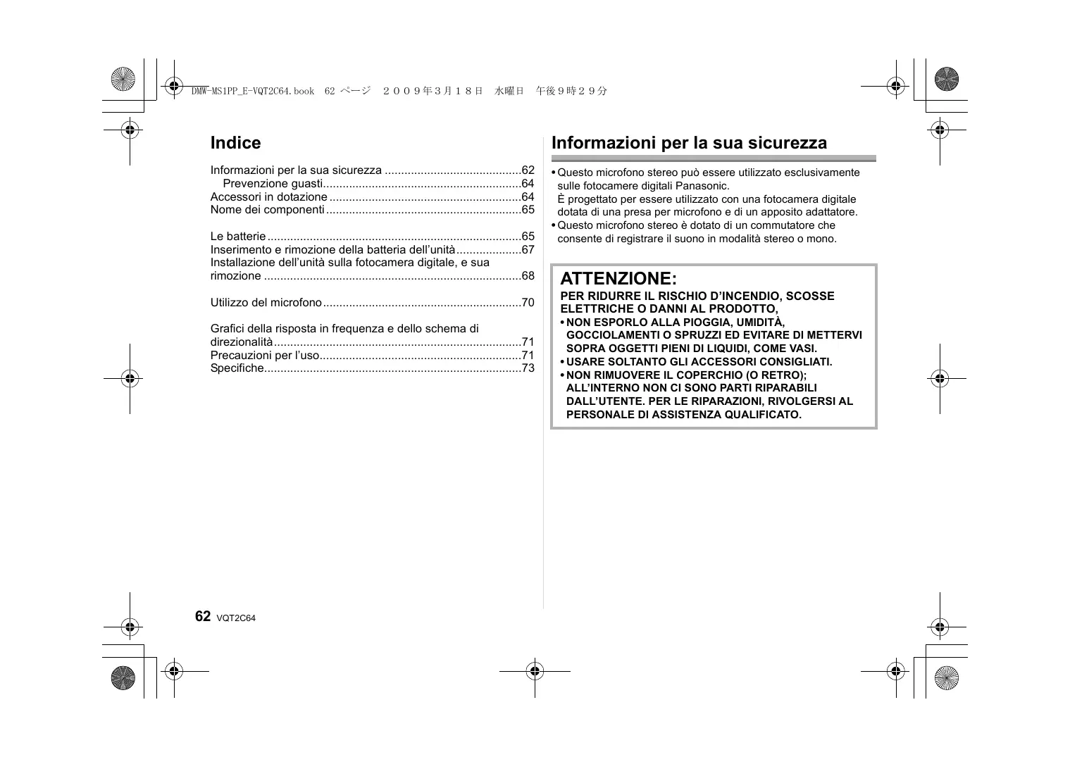 - Questo può causare cortocircuiti o la produzione di calore, con il rischio di gravi ustioni se si toccano le batterie. Non tentare di ricaricare le batterie a secco. Non gettare le batterie nel fuoco e non esporle a calore eccessivo, ad esempio lasciandole al sole. DMW-MS1PP_E-VQT2C64.book 73 ページ