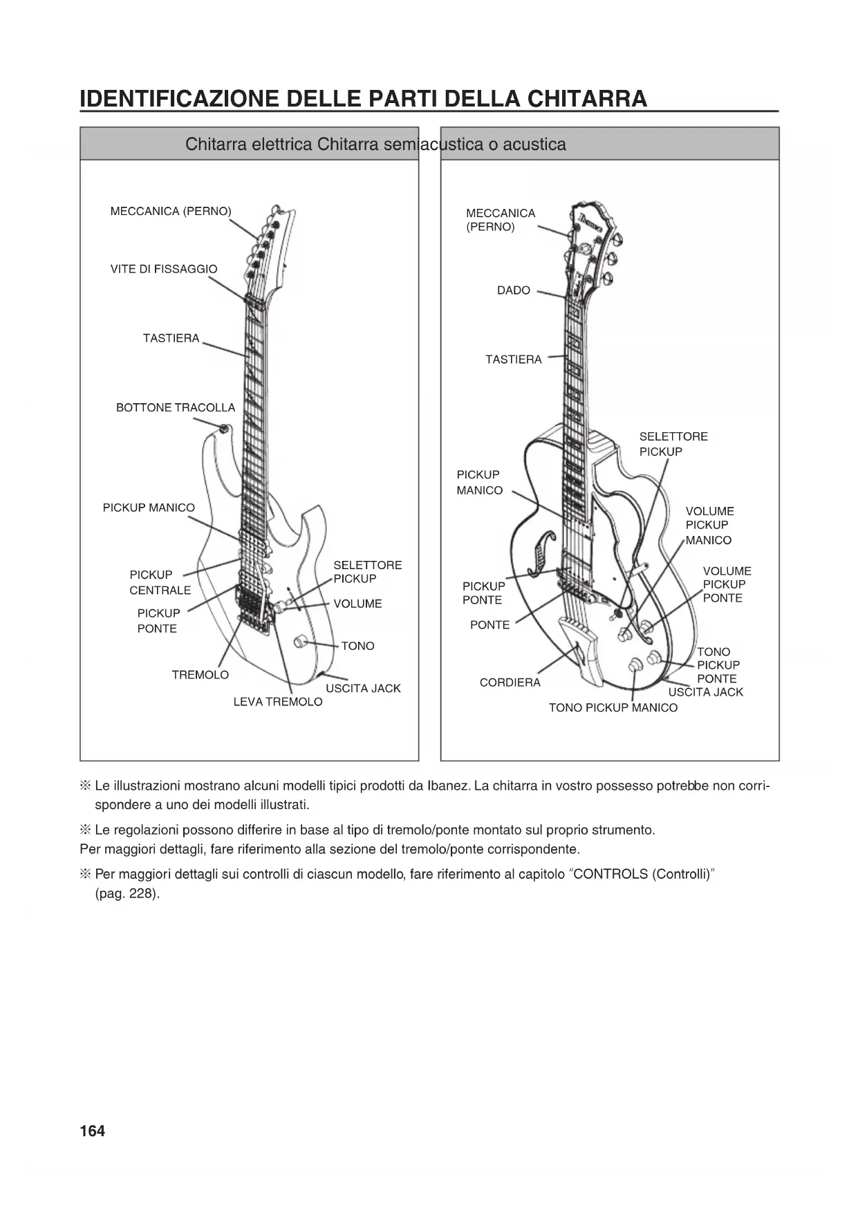 Chitarra elettrica Chitarra semiacustica o acustica Le illustrazioni mostrano alcuni modelli tipici prodotti da Ibanez. La chitarra in vostro possesso potrebbe non corri- ※ spondere a uno dei modelli illustrati. Le regolazioni possono differire in base al tipo di tremolo/ponte montato sul proprio strumento. ※ Per maggiori dettagli, fare riferimento alla sezione del tremolo/ponte corrispondente. Per maggiori dettagli sui controlli di ciascun modello, fare riferimento al capitolo “CONTROLS (Controlli)” ※ (pag. 228). MECCANICA (PERNO)