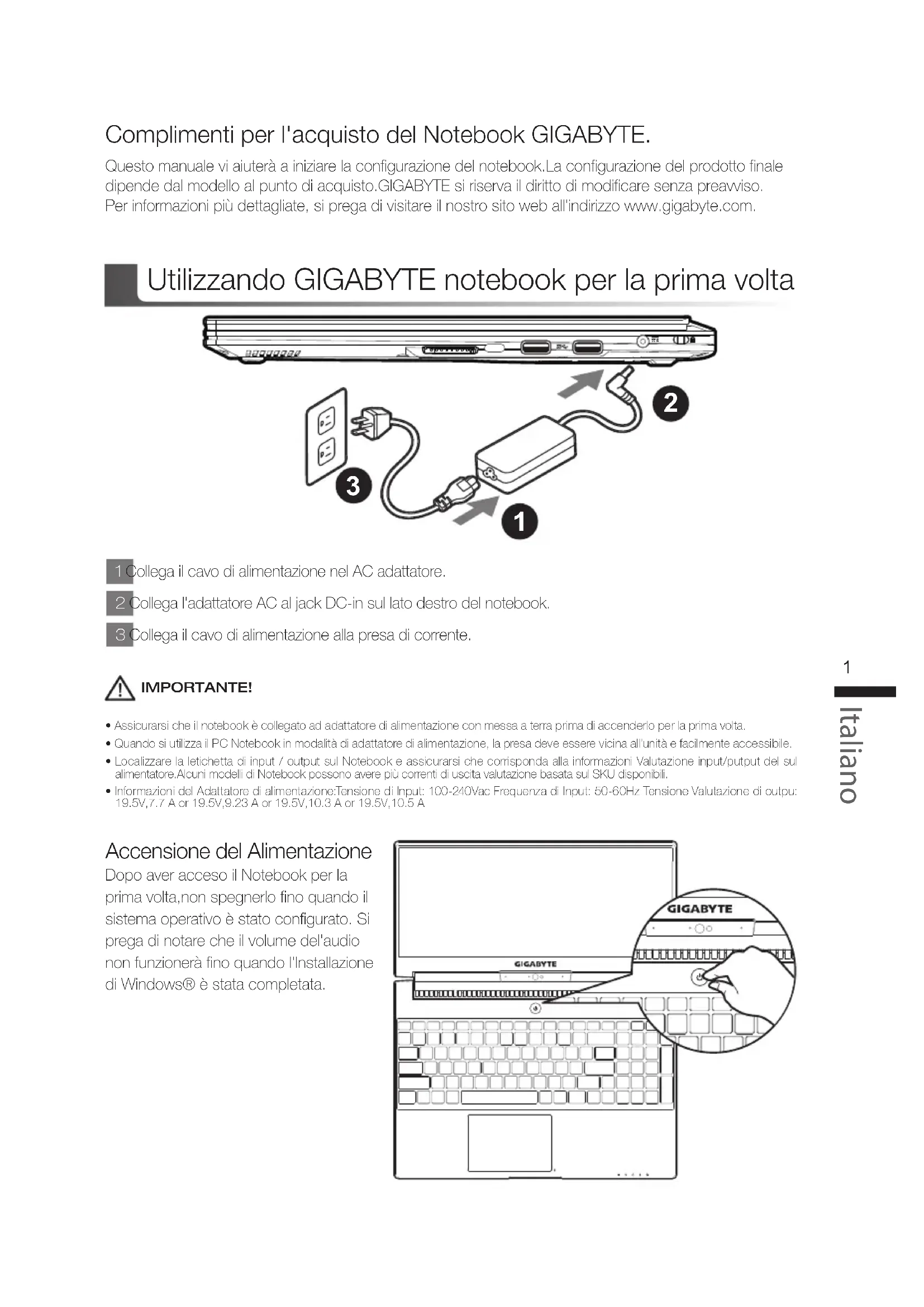 Complimenti per l'acquisto del Notebook GIGABYTE. Questo manuale vi aiuterà a iniziare la configurazione del notebook.La configurazione del prodotto finale dipende dal modello al punto di acquisto.GIGABYTE si riserva il diritto di modificare senza preavviso. Per informazioni più dettagliate, si prega di visitare il nostro sito web all'indirizzo www.gigabyte.com.1 Collega il cavo di alimentazione nel AC adattatore.2 Collega l'adattatore AC al jack DC-in sul lato destro del notebook.3 Collega il cavo di alimentazione alla presa di corrente. Accensione del Alimentazione Dopo aver acceso il Notebook per la prima volta,non spegnerlo fino quando il sistema operativo è stato configurato. Si prega di notare che il volume del'audio non funzionerà fino quando l'Installazione di Windows® è stata completata. Utilizzando GIGABYTE notebook per la prima volta IMPORTANTE!