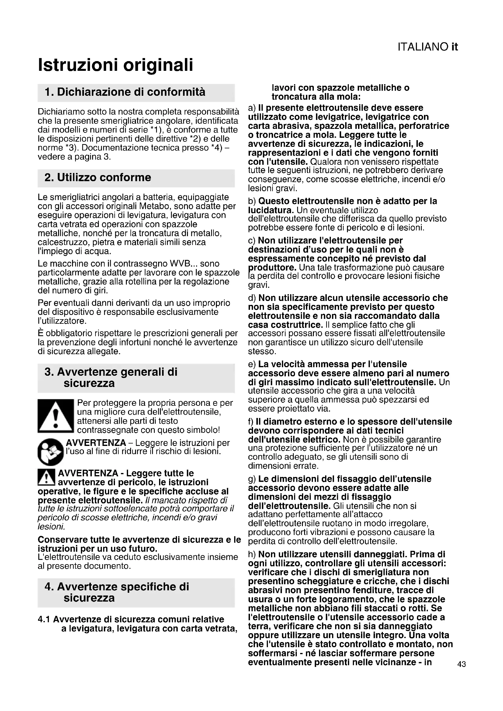 Istruzioni originali Dichiariamo sotto la nostra completa responsabilità che la presente smerigliatrice angolare, identificata dai modelli e numeri di serie *1), è conforme a tutte le disposizioni pertinenti delle direttive *2) e delle norme *3). Documentazione tecnica presso *4) – vedere a pagina 3. Le smerigliatrici angolari a batteria, equipaggiate con gli accessori originali Metabo, sono adatte per eseguire operazioni di levigatura, levigatura con carta vetrata ed operazioni con spazzole metalliche, nonché per la troncatura di metallo, calcestruzzo, pietra e materiali simili senza l'impiego di acqua. Le macchine con il contrassegno WVB... sono particolarmente adatte per lavorare con le spazzole metalliche, grazie alla rotellina per la regolazione del numero di giri. Per eventuali danni derivanti da un uso improprio del dispositivo è responsabile esclusivamente l’utilizzatore. È obbligatorio rispettare le prescrizioni generali per la prevenzione degli infortuni nonché le avvertenze di sicurezza allegate. Per proteggere la propria persona e per una migliore cura dell'elettroutensile, attenersi alle parti di testo contrassegnate con questo simbolo! AVVERTENZA – Leggere le istruzioni per l’uso al fine di ridurre il rischio di lesioni. AVVERTENZA - Leggere tutte le avvertenze di pericolo, le istruzioni operative, le figure e le specifiche accluse al presente elettroutensile. Il mancato rispetto di tutte le istruzioni sottoelencate potrà comportare il pericolo di scosse elettriche, incendi e/o gravi lesioni. Conservare tutte le avvertenze di sicurezza e le istruzioni per un uso futuro. L'elettroutensile va ceduto esclusivamente insieme al presente documento.
