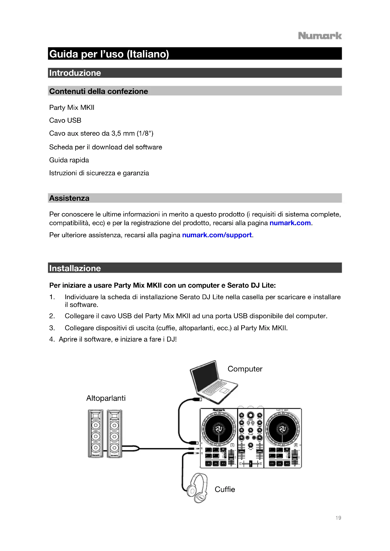 Assistenza Per conoscere le ultime informazioni in merito a questo prodotto (i requisiti di sistema complete, compatibilità, ecc) e per la registrazione del prodotto, recarsi alla pagina numark.com. Per ulteriore assistenza, recarsi alla pagina numark.com/support.