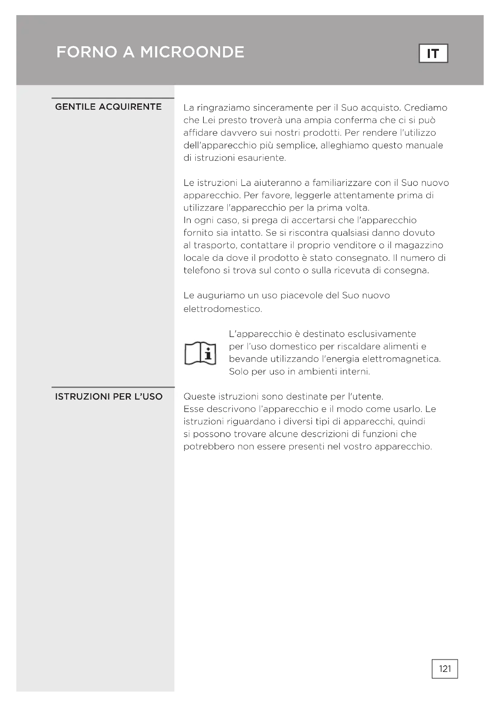 La ringraziamo sinceramente per il Suo acquisto. Crediamo che Lei presto troverà una ampia conferma che ci si può adare davvero sui nostri prodotti. Per rendere l'utilizzo dell'apparecchio più semplice, alleghiamo questo manuale di istruzioni esauriente. Le istruzioni La aiuteranno a familiarizzare con il Suo nuovo apparecchio. Per favore, leggerle attentamente prima di utilizzare l'apparecchio per la prima volta. In ogni caso, si prega di accertarsi che l'apparecchio fornito sia intatto. Se si riscontra qualsiasi danno dovuto al trasporto, contattare il proprio venditore o il magazzino locale da dove il prodotto è stato consegnato. Il numero di telefono si trova sul conto o sulla ricevuta di consegna. Le auguriamo un uso piacevole del Suo nuovo elettrodomestico. L'apparecchio è destinato esclusivamente per l’uso domestico per riscaldare alimenti e bevande utilizzando l'energia elettromagnetica. Solo per uso in ambienti interni. Queste istruzioni sono destinate per l'utente. Esse descrivono l’apparecchio e il modo come usarlo. Le istruzioni riguardano i diversi tipi di apparecchi, quindi si possono trovare alcune descrizioni di funzioni che potrebbero non essere presenti nel vostro apparecchio. GENTILE ACQUIRENTE
