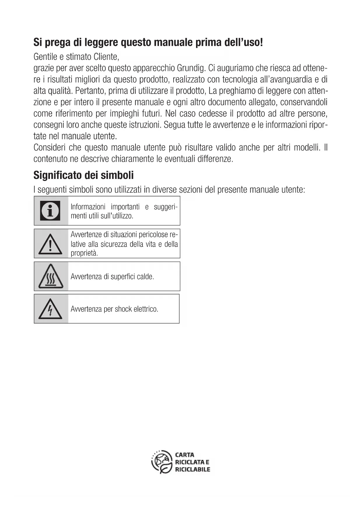 - Ne placez pas de charges lourdes sur l’appareil ou sur l’emballage. L’appareil peut être endom- magé. 6 DépannageSi prega di leggere questo manuale prima dell’uso! Gentile e stimato Cliente, grazie per aver scelto questo apparecchio Grundig. Ci auguriamo che riesca ad ottene- re i risultati migliori da questo prodotto, realizzato con tecnologia all’avanguardia e di alta qualità. Pertanto, prima di utilizzare il prodotto, La preghiamo di leggere con atten- zione e per intero il presente manuale e ogni altro documento allegato, conservandoli come riferimento per impieghi futuri. Nel caso cedesse il prodotto ad altre persone, consegni loro anche queste istruzioni. Segua tutte le avvertenze e le informazioni ripor- tate nel manuale utente. Consideri che questo manuale utente può risultare valido anche per altri modelli. Il contenuto ne descrive chiaramente le eventuali differenze. Significato dei simboli I seguenti simboli sono utilizzati in diverse sezioni del presente manuale utente:
