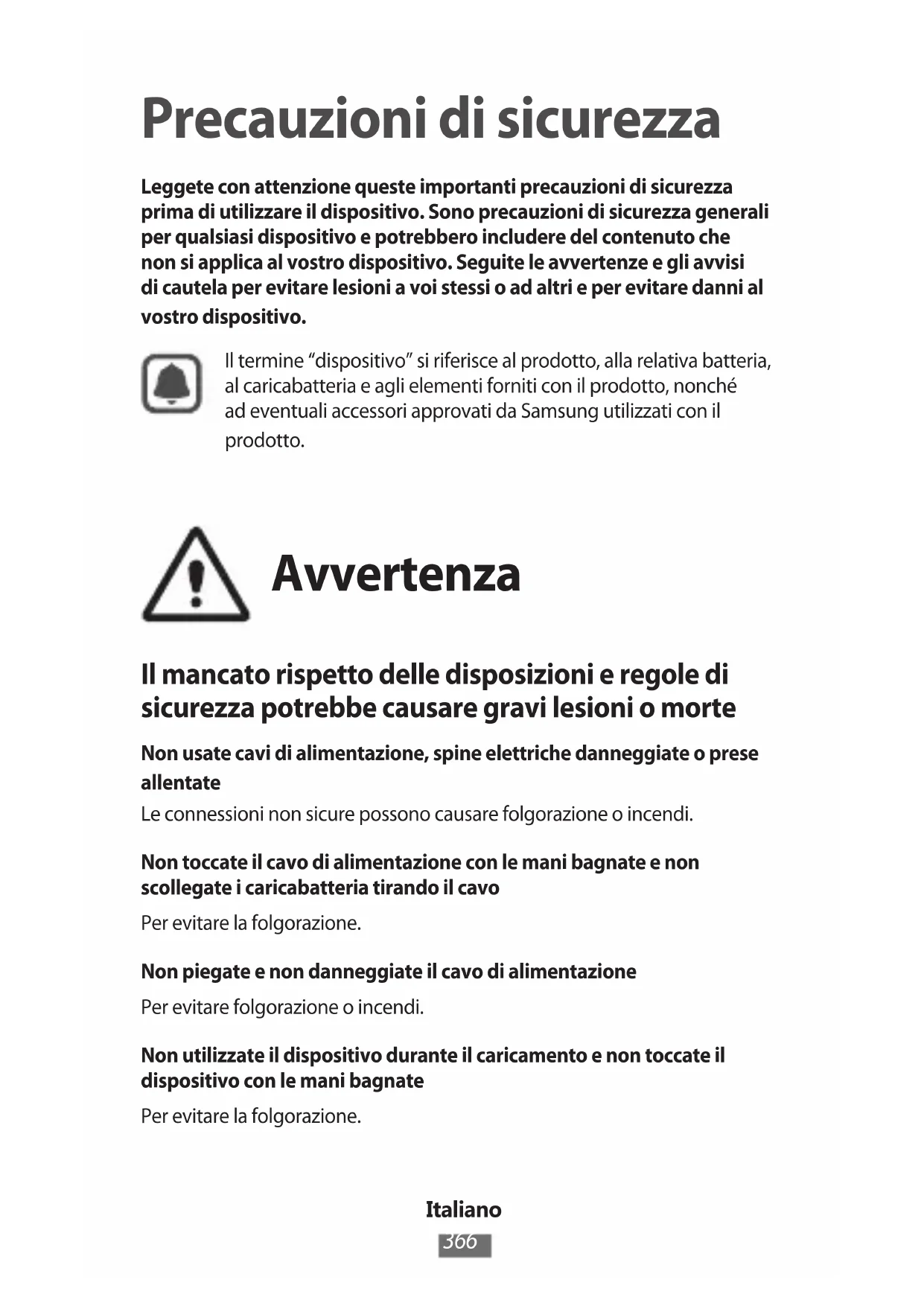 Precauzioni di sicurezza Leggete con attenzione queste importanti precauzioni di sicurezza prima di utilizzare il dispositivo. Sono precauzioni di sicurezza generali per qualsiasi dispositivo e potrebbero includere del contenuto che non si applica al vostro dispositivo. Seguite le avvertenze e gli avvisi di cautela per evitare lesioni a voi stessi o ad altri e per evitare danni al vostro dispositivo.Il termine “dispositivo” si riferisce al prodotto, alla relativa batteria, al caricabatteria e agli elementi forniti con il prodotto, nonché ad eventuali accessori approvati da Samsung utilizzati con il prodotto. Avvertenza Il mancato rispetto delle disposizioni e regole di sicurezza potrebbe causare gravi lesioni o morte Non usate cavi di alimentazione, spine elettriche danneggiate o prese allentateLe connessioni non sicure possono causare folgorazione o incendi.Non toccate il cavo di alimentazione con le mani bagnate e non scollegate i caricabatteria tirando il cavoPer evitare la folgorazione.Non piegate e non danneggiate il cavo di alimentazionePer evitare folgorazione o incendi.Non utilizzate il dispositivo durante il caricamento e non toccate il dispositivo con le mani bagnatePer evitare la folgorazione.Italiano