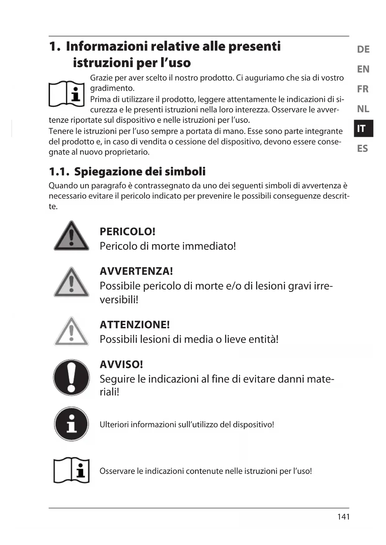 1. Informazioni relative alle presenti istruzioni per l’uso ........................ 141
