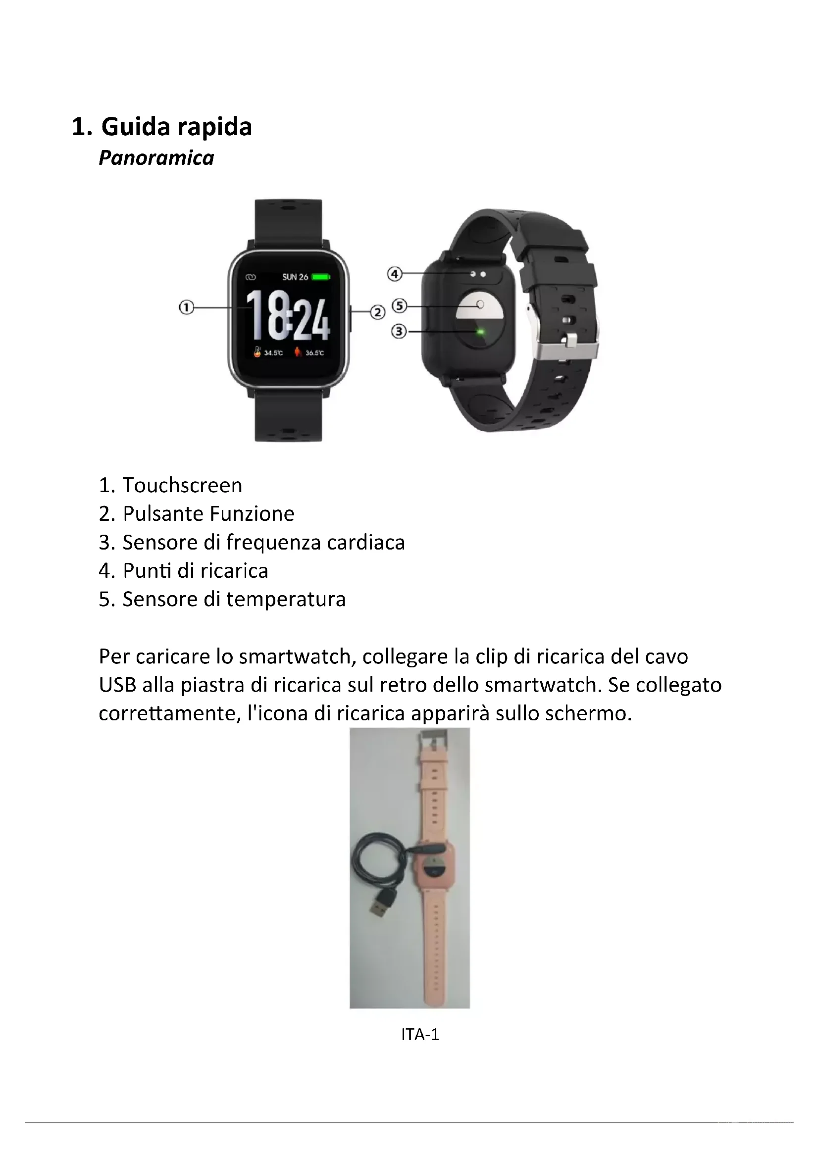 Accensione: Tenere premuto il tasto funzione per 3 secondi. Passare alla schermata menu: Scorrere destra o sinistra la schermata del quadrante dell'orologio. Selezione di una funzione: Scorrere verso l'alto/il basso o verso destra/sinistra la schermata del quadrante dell'orologio e toccare l'icona. Conferma: Toccare l'icona. Uscita dal menu: Far scorrere lo schermo da sinistra a destra. Ritornare al quadrante dell'orologio: Premere brevemente il pulsante funzione in qualsiasi schermata. Verifica delle messaggi: Scorri dal basso verso l'alto nella schermata del quadrante.ITA-4