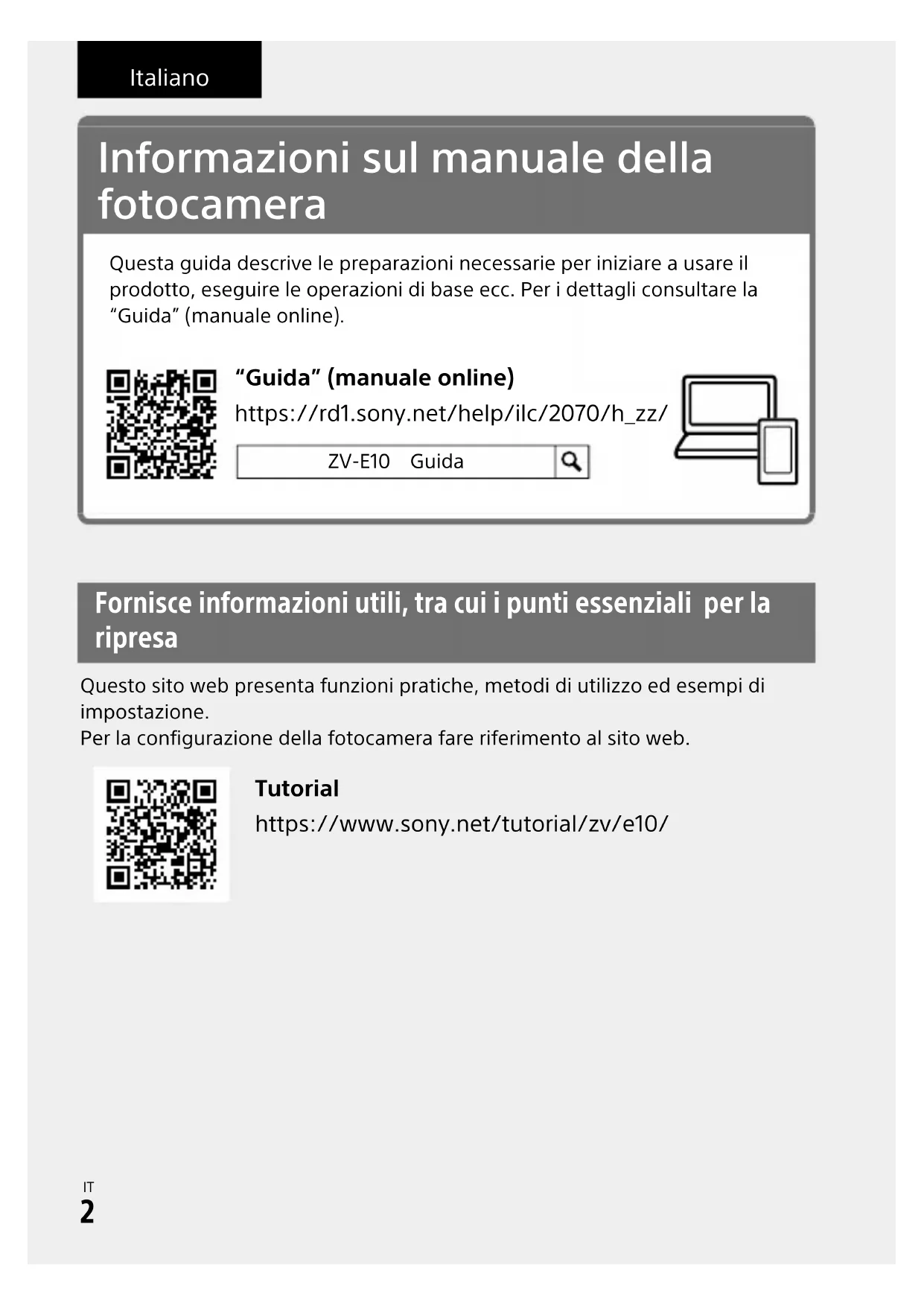 \\Win-473\camera\CX88700(RK)_SG\Multi\04_Compose\Printed_in_China\5027835311_14lang_FrEsPtBunkiMoto\5027835311ZVE10CEC\05IT-ZVE10CEC\05IT.indd DTP data saved: 2021/03/12 08:40 PDF file created: 2021/03/12 08:40 Italiano Fornisce informazioni utili, tra cui i punti essenziali per la ripresa Questo sito web presenta funzioni pratiche, metodi di utilizzo ed esempi di impostazione.Per la configurazione della fotocamera fare riferimento al sito web. Tutorial https://www.sony.net/tutorial/zv/e10/ Informazioni sul manuale della fotocamera Questa guida descrive le preparazioni necessarie per iniziare a usare il prodotto, eseguire le operazioni di base ecc. Per i dettagli consultare la “Guida” (manuale online). https://rd1.sony.net/help/ilc/2070/h_zz/ “Guida” (manuale online) ZV-E10 GuidaZV-E105-027-835-31(1)