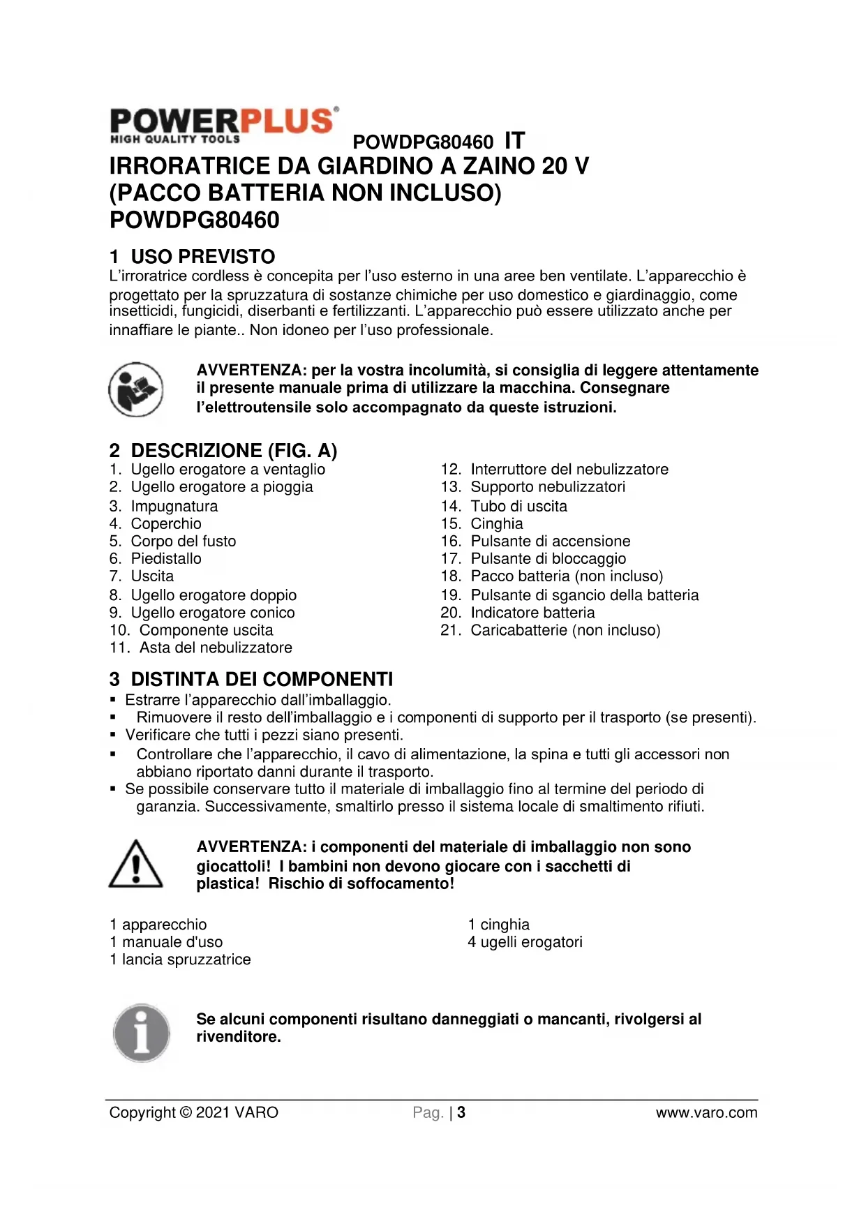 - Se possibile conservare tutto il materiale di imballaggio fino al termine del periodo di garanzia. Successivamente, smaltirlo presso il sistema locale di smaltimento rifiuti. AVVERTENZA: i componenti del materiale di imballaggio non sono giocattoli! I bambini non devono giocare con i sacchetti di plastica! Rischio di soffocamento! 1 apparecchio 1 manuale d'uso 1 lancia spruzzatrice 1 cinghia 4 ugelli erogatori Se alcuni componenti risultano danneggiati o mancanti, rivolgersi al rivenditore.POWDPG80460 IT Copyright © 2021 VARO Pag. | 4 www.varo.com 4 SIMBOLI Nel presente manuale e/o sull’apparecchio sono utilizzati i seguenti simboli: