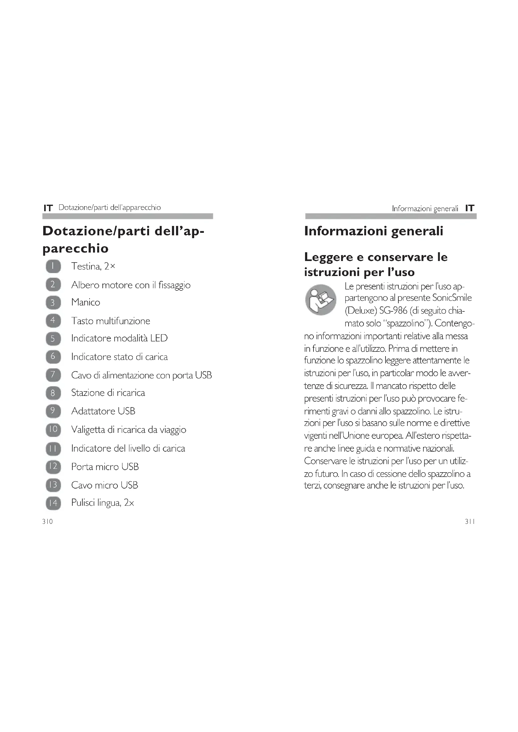 Pulisci lingua, 2x Informazioni generali Leggere e conservare le istruzioni per l’uso Le presenti istruzioni per l’uso ap- partengono al presente SonicSmile (Deluxe) SG-986 (di seguito chia- mato solo “spazzolino”). Contengo- no informazioni importanti relative alla messa in funzione e all’utilizzo. Prima di mettere in funzione lo spazzolino leggere attentamente le istruzioni per l’uso, in particolar modo le avver- tenze di sicurezza. Il mancato rispetto delle presenti istruzioni per l’uso può provocare fe- rimenti gravi o danni allo spazzolino. Le istru- zioni per l’uso si basano sulle norme e direttive vigenti nell’Unione europea. All’estero rispetta- re anche linee guida e normative nazionali. Conservare le istruzioni per l’uso per un utiliz- zo futuro. In caso di cessione dello spazzolino a terzi, consegnare anche le istruzioni per l’uso.Informazioni generali