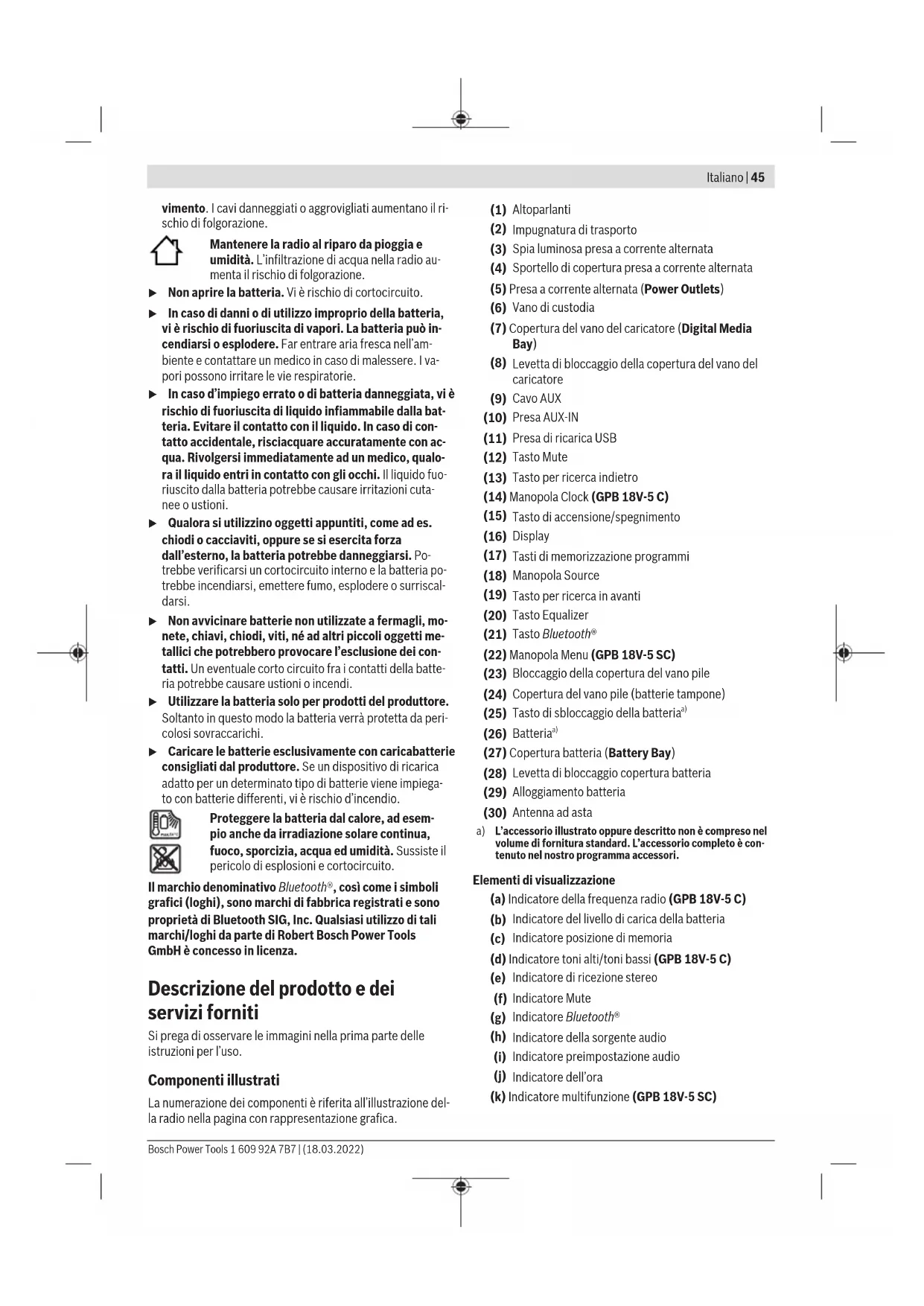 L’accessorio illustrato oppure descritto non è compreso nel volume di fornitura standard. L’accessorio completo è con- tenuto nel nostro programma accessori. Elementi di visualizzazione (a) Indicatore della frequenza radio (GPB18V‑5C) (b) Indicatore del livello di carica della batteria (c) Indicatore posizione di memoria (d) Indicatore toni alti/toni bassi (GPB18V‑5C) (e) Indicatore di ricezione stereo (f) Indicatore Mute (g) Indicatore Bluetooth® (h) Indicatore della sorgente audio (i) Indicatore preimpostazione audio (j) Indicatore dell’ora (k) Indicatore multifunzione (GPB18V‑5SC) Bosch Power Tools 1 609 92A 7B7 | (18.03.2022)46 | Italiano Dati tecnici Radio da cantiere GPB 18V-5 C GPB 18V-5 SC Codice prodotto 3601DA40.. 3601DA41.. Ricezione DAB+ – ● Tensione di funzionamento – con collegamento alla rete elettrica V 230/110 230/110 – con funzionamento a batteria V 18 18 Potenza nominale amplificatore W 4×5 4×5 Campo di ricezione FM MHz 87,5−108 87,5−108 Campo di ricezione DAB+ MHz − 174,928−239,200 Compatibilità Bluetooth® Bluetooth® 5.0 Bluetooth® 5.0 Campo di frequenza di funzionamento Bluetooth® MHz 2402−2480 2402−2480 Potenza di trasmissione Bluetooth® max. mW 10 10 Batterie tampone 2pile da 1,5V LR6 (AA) 2pile da 1,5V LR6 (AA) Peso secondo EPTA-Procedure 01:2014 kg 9,2−10,2