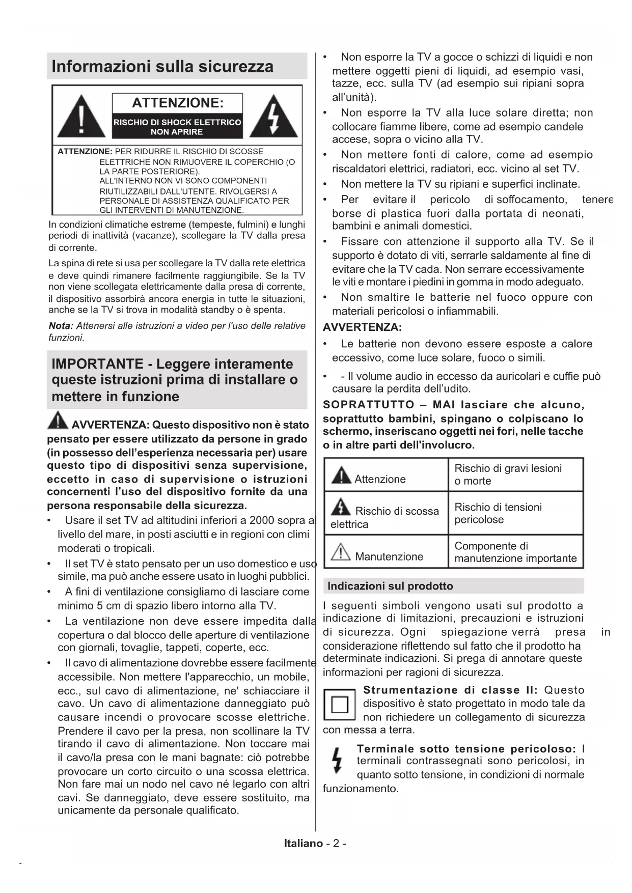 - Informazioni sullo smaltimento Italiano - 2 - Informazioni sulla sicurezza ATTENZIONE: RISCHIO DI SHOCK ELETTRICONON APRIREATTENZIONE: PER RIDURRE IL RISCHIO DI SCOSSE ELETTRICHE NON RIMUOVERE IL COPERCHIO (O LA PARTE POSTERIORE). ALL'INTERNO NON VI SONO COMPONENTI RIUTILIZZABILI DALL'UTENTE. RIVOLGERSI A PERSONALE DI ASSISTENZA QUALIFICATO PER GLI INTERVENTI DI MANUTENZIONE.Nota: Attenersi alle istruzioni a video per l'uso delle relative funzioni.In condizioni climatiche estreme (tempeste, fulmini) e lunghi periodi di inattività (vacanze), scollegare la TV dalla presa di corrente.La spina di rete si usa per scollegare la TV dalla rete elettrica e deve quindi rimanere facilmente raggiungibile. Se la TV non viene scollegata elettricamente dalla presa di corrente, il dispositivo assorbirà ancora energia in tutte le situazioni, anche se la TV si trova in modalità standby o è spenta. IMPORTANTE - Leggere interamente queste istruzioni prima di installare o mettere in funzione AVVERTENZA: Questo dispositivo non è stato pensato per essere utilizzato da persone in grado (in possesso dell’esperienza necessaria per) usare questo tipo di dispositivi senza supervisione, eccetto in caso di supervisione o istruzioni concernenti l’uso del dispositivo fornite da una persona responsabile della sicurezza. Usare il set TV ad altitudini inferiori a 2000 sopra al livello del mare, in posti asciutti e in regioni con climi moderati o tropicali. Il set TV è stato pensato per un uso domestico e uso simile, ma può anche essere usato in luoghi pubblici. p. 39