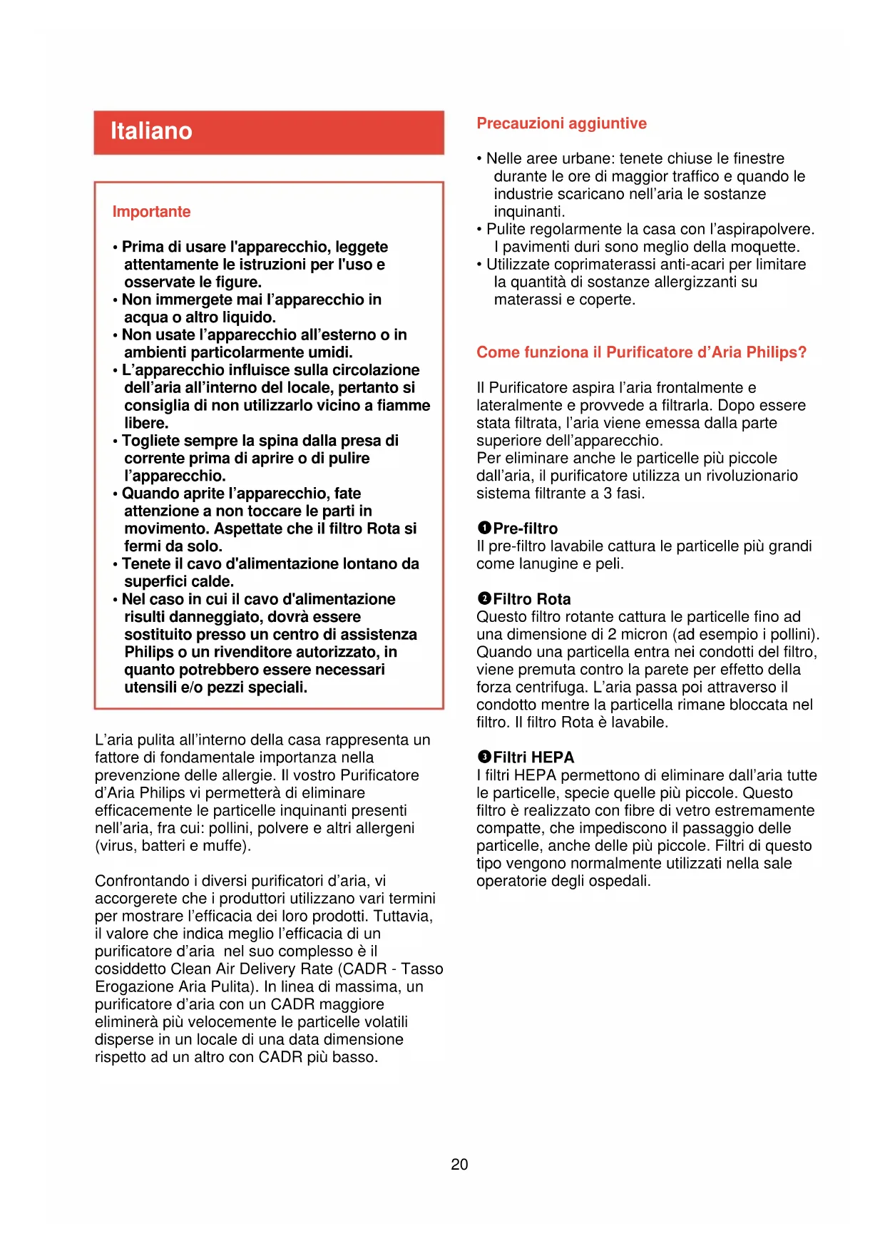 - Utilizzate coprimaterassi anti-acari per limitare la quantità di sostanze allergizzanti su materassi e coperte. Come funziona il Purificatore d’Aria Philips? Il Purificatore aspira l’aria frontalmente e lateralmente e provvede a filtrarla. Dopo essere stata filtrata, l’aria viene emessa dalla parte superiore dell’apparecchio. Per eliminare anche le particelle più piccole dall’aria, il purificatore utilizza un rivoluzionario sistema filtrante a 3 fasi. 1 Pre-filtro Il pre-filtro lavabile cattura le particelle più grandi come lanugine e peli. 2 Filtro Rota Questo filtro rotante cattura le particelle fino ad una dimensione di 2 micron (ad esempio i pollini). Quando una particella entra nei condotti del filtro, viene premuta contro la parete per effetto della forza centrifuga. L’aria passa poi attraverso il condotto mentre la particella rimane bloccata nel filtro. Il filtro Rota è lavabile. 3 Filtri HEPA I filtri HEPA permettono di eliminare dall’aria tutte le particelle, specie quelle più piccole. Questo filtro è realizzato con fibre di vetro estremamente compatte, che impediscono il passaggio delle particelle, anche delle più piccole. Filtri di questo tipo vengono normalmente utilizzati nella sale operatorie degli ospedali. Italiano L’aria pulita all’interno della casa rappresenta un fattore di fondamentale importanza nella prevenzione delle allergie. Il vostro Purificatore d’Aria Philips vi permetterà di eliminare efficacemente le particelle inquinanti presenti nell’aria, fra cui: pollini, polvere e altri allergeni (virus, batteri e muffe). Confrontando i diversi purificatori d’aria, vi accorgerete che i produttori utilizzano vari termini per mostrare l’efficacia dei loro prodotti. Tuttavia, il valore che indica meglio l’efficacia di un purificatore d’aria nel suo complesso è il cosiddetto Clean Air Delivery Rate (CADR - Tasso Erogazione Aria Pulita). In linea di massima, un purificatore d’aria con un CADR maggiore eliminerà più velocemente le particelle volatili disperse in un locale di una data dimensione rispetto ad un altro con CADR più basso.21 Descrizione generale (fig. 1)