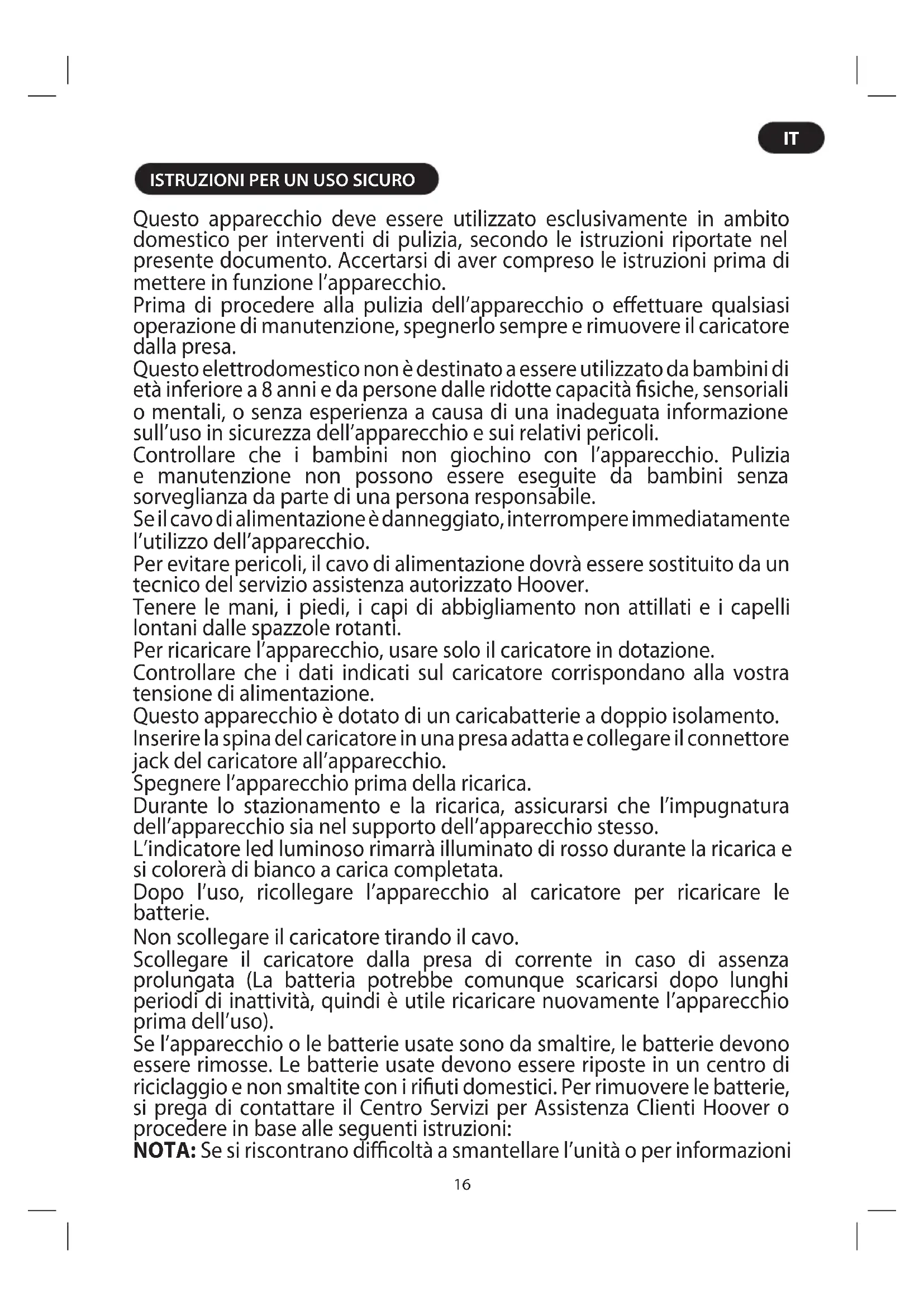 Questo apparecchio deve essere utilizzato esclusivamente in ambito domestico per interventi di pulizia, secondo le istruzioni riportate nel presente documento. Accertarsi di aver compreso le istruzioni prima di mettere in funzione l’apparecchio. Prima di procedere alla pulizia dell’apparecchio o effettuare qualsiasi operazione di manutenzione, spegnerlo sempre e rimuovere il caricatore dalla presa. Questo elettrodomestico non è destinato a essere utilizzato da bambini di età inferiore a 8 anni e da persone dalle ridotte capacità fisiche, sensoriali o mentali, o senza esperienza a causa di una inadeguata informazione sull’uso in sicurezza dell’apparecchio e sui relativi pericoli. Controllare che i bambini non giochino con l’apparecchio. Pulizia e manutenzione non possono essere eseguite da bambini senza sorveglianza da parte di una persona responsabile. Se il cavo di alimentazione è danneggiato, interrompere immediatamente l’utilizzo dell’apparecchio. Per evitare pericoli, il cavo di alimentazione dovrà essere sostituito da un tecnico del servizio assistenza autorizzato Hoover. Tenere le mani, i piedi, i capi di abbigliamento non attillati e i capelli lontani dalle spazzole rotanti. Per ricaricare l’apparecchio, usare solo il caricatore in dotazione. Controllare che i dati indicati sul caricatore corrispondano alla vostra tensione di alimentazione. Questo apparecchio è dotato di un caricabatterie a doppio isolamento. Inserire la spina del caricatore in una presa adatta e collegare il connettore jack del caricatore all’apparecchio. Spegnere l’apparecchio prima della ricarica. Durante lo stazionamento e la ricarica, assicurarsi che l’impugnatura dell’apparecchio sia nel supporto dell’apparecchio stesso. L’indicatore led luminoso rimarrà illuminato di rosso durante la ricarica e si colorerà di bianco a carica completata. Dopo l’uso, ricollegare l’apparecchio al caricatore per ricaricare le batterie. Non scollegare il caricatore tirando il cavo. Scollegare il caricatore dalla presa di corrente in caso di assenza prolungata (La batteria potrebbe comunque scaricarsi dopo lunghi periodi di inattività, quindi è utile ricaricare nuovamente l’apparecchio prima dell’uso). Se l’apparecchio o le batterie usate sono da smaltire, le batterie devono essere rimosse. Le batterie usate devono essere riposte in un centro di riciclaggio e non smaltite con i rifiuti domestici. Per rimuovere le batterie, si prega di contattare il Centro Servizi per Assistenza Clienti Hoover o procedere in base alle seguenti istruzioni: NOTA: Se si riscontrano difficoltà a smantellare l’unità o per informazioni17 più dettagliate sul trattamento, recupero e riciclaggio di questo apparecchio, si prega di contattare l’ufficio comunale per il servizio smaltimento rifiuti. IMPORTANTE: Scaricare sempre completamente le batterie prima della rimozione ed assicurarsi che il caricatore sia scollegato. Disposizioni sullo smaltimento della batteria a fine vita dell’apparecchio Smaltire le batterie in sicurezza.