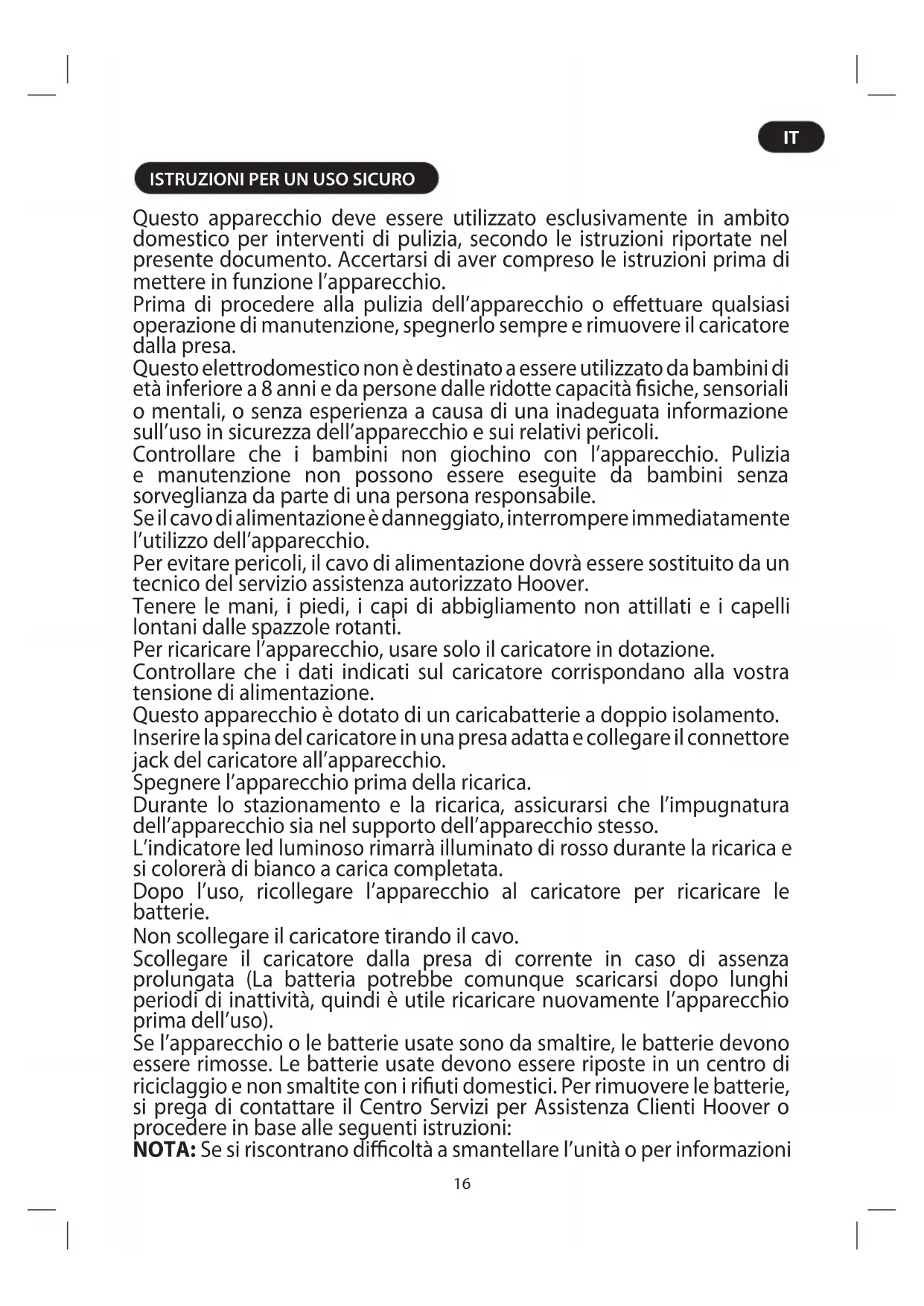 Questo apparecchio deve essere utilizzato esclusivamente in ambito domestico per interventi di pulizia, secondo le istruzioni riportate nel presente documento. Accertarsi di aver compreso le istruzioni prima di mettere in funzione l’apparecchio. Prima di procedere alla pulizia dell’apparecchio o effettuare qualsiasi operazione di manutenzione, spegnerlo sempre e rimuovere il caricatore dalla presa. Questo elettrodomestico non è destinato a essere utilizzato da bambini di età inferiore a 8 anni e da persone dalle ridotte capacità fisiche, sensoriali o mentali, o senza esperienza a causa di una inadeguata informazione sull’uso in sicurezza dell’apparecchio e sui relativi pericoli. Controllare che i bambini non giochino con l’apparecchio. Pulizia e manutenzione non possono essere eseguite da bambini senza sorveglianza da parte di una persona responsabile. Se il cavo di alimentazione è danneggiato, interrompere immediatamente l’utilizzo dell’apparecchio. Per evitare pericoli, il cavo di alimentazione dovrà essere sostituito da un tecnico del servizio assistenza autorizzato Hoover. Tenere le mani, i piedi, i capi di abbigliamento non attillati e i capelli lontani dalle spazzole rotanti. Per ricaricare l’apparecchio, usare solo il caricatore in dotazione. Controllare che i dati indicati sul caricatore corrispondano alla vostra tensione di alimentazione. Questo apparecchio è dotato di un caricabatterie a doppio isolamento. Inserire la spina del caricatore in una presa adatta e collegare il connettore jack del caricatore all’apparecchio. Spegnere l’apparecchio prima della ricarica. Durante lo stazionamento e la ricarica, assicurarsi che l’impugnatura dell’apparecchio sia nel supporto dell’apparecchio stesso. L’indicatore led luminoso rimarrà illuminato di rosso durante la ricarica e si colorerà di bianco a carica completata. Dopo l’uso, ricollegare l’apparecchio al caricatore per ricaricare le batterie. Non scollegare il caricatore tirando il cavo. Scollegare il caricatore dalla presa di corrente in caso di assenza prolungata (La batteria potrebbe comunque scaricarsi dopo lunghi periodi di inattività, quindi è utile ricaricare nuovamente l’apparecchio prima dell’uso). Se l’apparecchio o le batterie usate sono da smaltire, le batterie devono essere rimosse. Le batterie usate devono essere riposte in un centro di riciclaggio e non smaltite con i rifiuti domestici. Per rimuovere le batterie, si prega di contattare il Centro Servizi per Assistenza Clienti Hoover o procedere in base alle seguenti istruzioni: NOTA: Se si riscontrano difficoltà a smantellare l’unità o per informazioni17 più dettagliate sul trattamento, recupero e riciclaggio di questo apparecchio, si prega di contattare l’ufficio comunale per il servizio smaltimento rifiuti. IMPORTANTE: Scaricare sempre completamente le batterie prima della rimozione ed assicurarsi che il caricatore sia scollegato. Disposizioni sullo smaltimento della batteria a fine vita dell’apparecchio Smaltire le batterie in sicurezza.