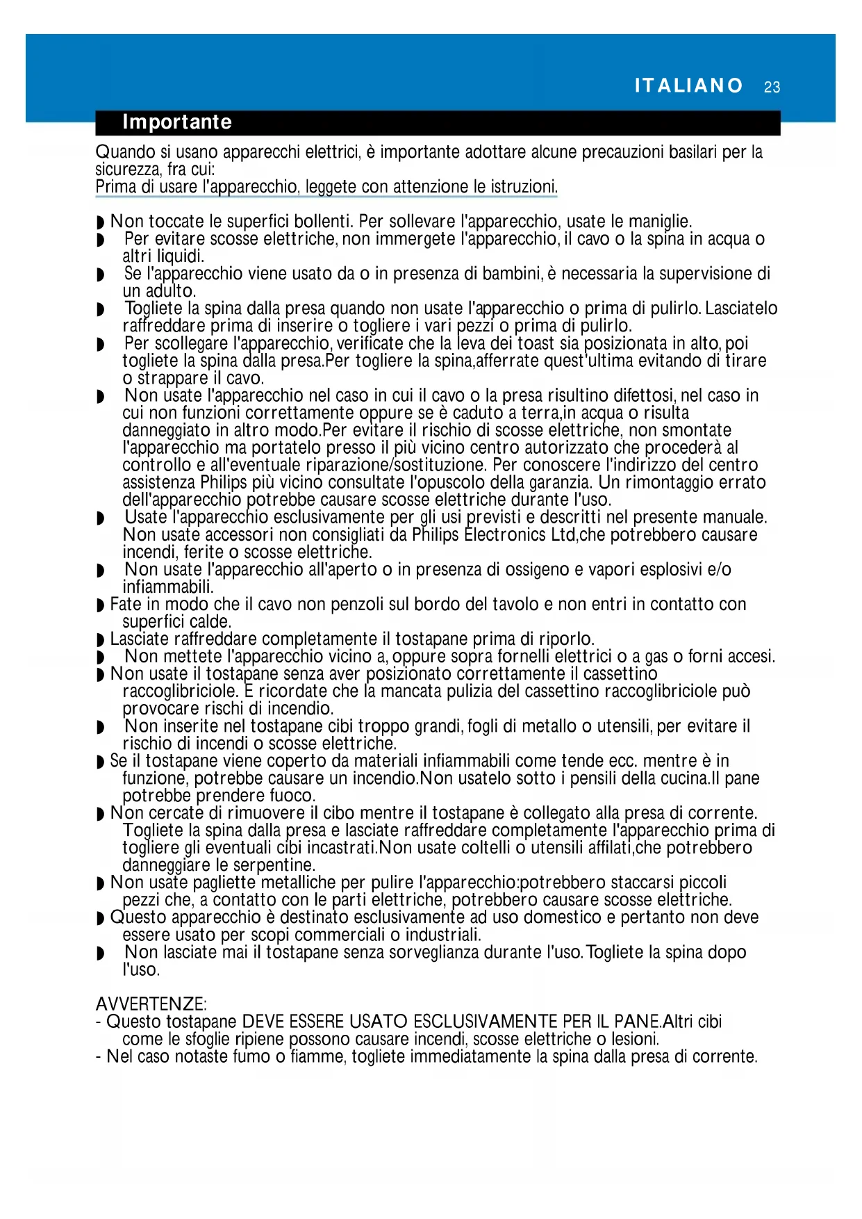 tostador (fig.1). ESPAÑOL22 Información y servicio Si necesita información o si tiene algún problema, visite la página Web de Philips en www.philips.com o póngase en contacto con el Servicio Philips de Atención al Cliente de su país (encontrará el número de teléfono en el folleto de la Garantía Mundial). Si en su país no hay Servicio Philips de Atención al Cliente, diríjase a su distribuidor local Philips o póngase en contacto con el Service Department of Philips Domestic Appliances and Personal Care BV. ESPAÑOL23 Importante Quando si usano apparecchi elettrici, è importante adottare alcune precauzioni basilari per la sicurezza, fra cui: Prima di usare l'apparecchio, leggete con attenzione le istruzioni. ◗ Non toccate le superfici bollenti. Per sollevare l'apparecchio, usate le maniglie. ◗ Per evitare scosse elettriche, non immergete l'apparecchio,il cavo o la spina in acqua o altri liquidi. ◗ Se l'apparecchio viene usato da o in presenza di bambini,è necessaria la supervisione di un adulto. ◗ Togliete la spina dalla presa quando non usate l'apparecchio o prima di pulirlo. Lasciatelo raffreddare prima di inserire o togliere i vari pezzi o prima di pulirlo. ◗ Per scollegare l'apparecchio,verificate che la leva dei toast sia posizionata in alto,poi togliete la spina dalla presa.Per togliere la spina,afferrate quest'ultima evitando di tirare o strappare il cavo. ◗ Non usate l'apparecchio nel caso in cui il cavo o la presa risultino difettosi, nel caso in cui non funzioni correttamente oppure se è caduto a terra,in acqua o risulta danneggiato in altro modo.Per evitare il rischio di scosse elettriche, non smontate l'apparecchio ma portatelo presso il più vicino centro autorizzato che procederà al controllo e all'eventuale riparazione/sostituzione. Per conoscere l'indirizzo del centro assistenza Philips più vicino consultate l'opuscolo della garanzia. Un rimontaggio errato dell'apparecchio potrebbe causare scosse elettriche durante l'uso. ◗ Usate l'apparecchio esclusivamente per gli usi previsti e descritti nel presente manuale. Non usate accessori non consigliati da Philips Electronics Ltd,che potrebbero causare incendi, ferite o scosse elettriche. ◗ Non usate l'apparecchio all'aperto o in presenza di ossigeno e vapori esplosivi e/o infiammabili. ◗ Fate in modo che il cavo non penzoli sul bordo del tavolo e non entri in contatto con superfici calde. ◗ Lasciate raffreddare completamente il tostapane prima di riporlo. ◗ Non mettete l'apparecchio vicino a, oppure sopra fornelli elettrici o a gas o forni accesi. ◗ Non usate il tostapane senza aver posizionato correttamente il cassettino raccoglibriciole. E ricordate che la mancata pulizia del cassettino raccoglibriciole può provocare rischi di incendio. ◗ Non inserite nel tostapane cibi troppo grandi, fogli di metallo o utensili, per evitare il rischio di incendi o scosse elettriche. ◗ Se il tostapane viene coperto da materiali infiammabili come tende ecc. mentre è in funzione, potrebbe causare un incendio.Non usatelo sotto i pensili della cucina.Il pane potrebbe prendere fuoco. ◗ Non cercate di rimuovere il cibo mentre il tostapane è collegato alla presa di corrente. Togliete la spina dalla presa e lasciate raffreddare completamente l'apparecchio prima di togliere gli eventuali cibi incastrati.Non usate coltelli o utensili affilati,che potrebbero danneggiare le serpentine. ◗ Non usate pagliette metalliche per pulire l'apparecchio:potrebbero staccarsi piccoli pezzi che, a contatto con le parti elettriche, potrebbero causare scosse elettriche. ◗ Questo apparecchio è destinato esclusivamente ad uso domestico e pertanto non deve essere usato per scopi commerciali o industriali. ◗ Non lasciate mai il tostapane senza sorveglianza durante l'uso.Togliete la spina dopo l'uso. AVVERTENZE: - Questo tostapane DEVE ESSERE USATO ESCLUSIVAMENTE PER IL PANE.Altri cibi come le sfoglie ripiene possono causare incendi, scosse elettriche o lesioni. - Nel caso notaste fumo o fiamme, togliete immediatamente la spina dalla presa di corrente. ITALIANO24 Caratteristiche Pareti esterne fredde Fessure extra-larghe Posizione sollevamento extra Leva toast Pulsante cancellazione (modelli: HD2524/2526/2528/2529/2544/2546/2548/2549) Impostazione cancellazione (mod. HD2525/2545) Pulsante scongelamento defrost (types: HD 2528/2529/2548/2549) Impostazione scongelamento defrost (mod. HD2524/2525/2544/2545) Pulsante panini (mod. HD2525/2528/2529/2545/2548/2549) Impostazione riscaldamento Controllo grado di doratura Cassettino raccoglibriciole estraibile Riscalda-focaccia Scomparto cavo Spegnimento automatico Come tostare il pane
