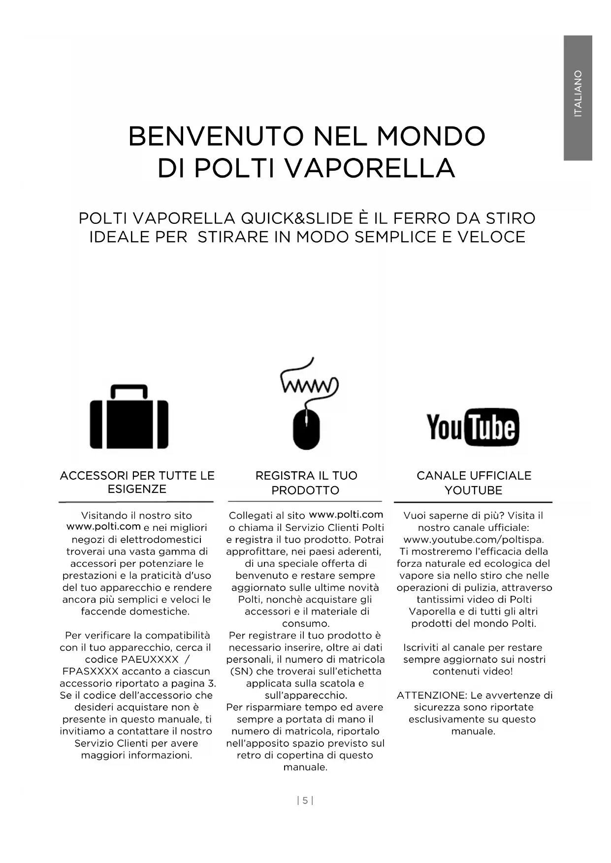 PRODOTTO Collegati al sito www.polti.com o chiama il Servizio Clienti Polti e registra il tuo prodotto. Potrai approfittare, nei paesi aderenti, di una speciale offerta di benvenuto e restare sempre aggiornato sulle ultime novità Polti, nonchè acquistare gli accessori e il materiale di consumo. Per registrare il tuo prodotto è necessario inserire, oltre ai dati personali, il numero di matricola (SN) che troverai sull’etichetta applicata sulla scatola e sull’apparecchio. Per risparmiare tempo ed avere sempre a portata di mano il numero di matricola, riportalo nell’apposito spazio previsto sul retro di copertina di questo manuale. CANALE UFFICIALE YOUTUBE Vuoi saperne di più? Visita il nostro canale ufficiale: www.youtube.com/poltispa. Ti mostreremo l’efficacia della forza naturale ed ecologica del vapore sia nello stiro che nelle operazioni di pulizia, attraverso tantissimi video di Polti Vaporella e di tutti gli altri prodotti del mondo Polti. Iscriviti al canale per restare sempre aggiornato sui nostri contenuti video! ATTENZIONE: Le avvertenze di sicurezza sono riportate esclusivamente su questo manuale.ITALIANO | 6 |