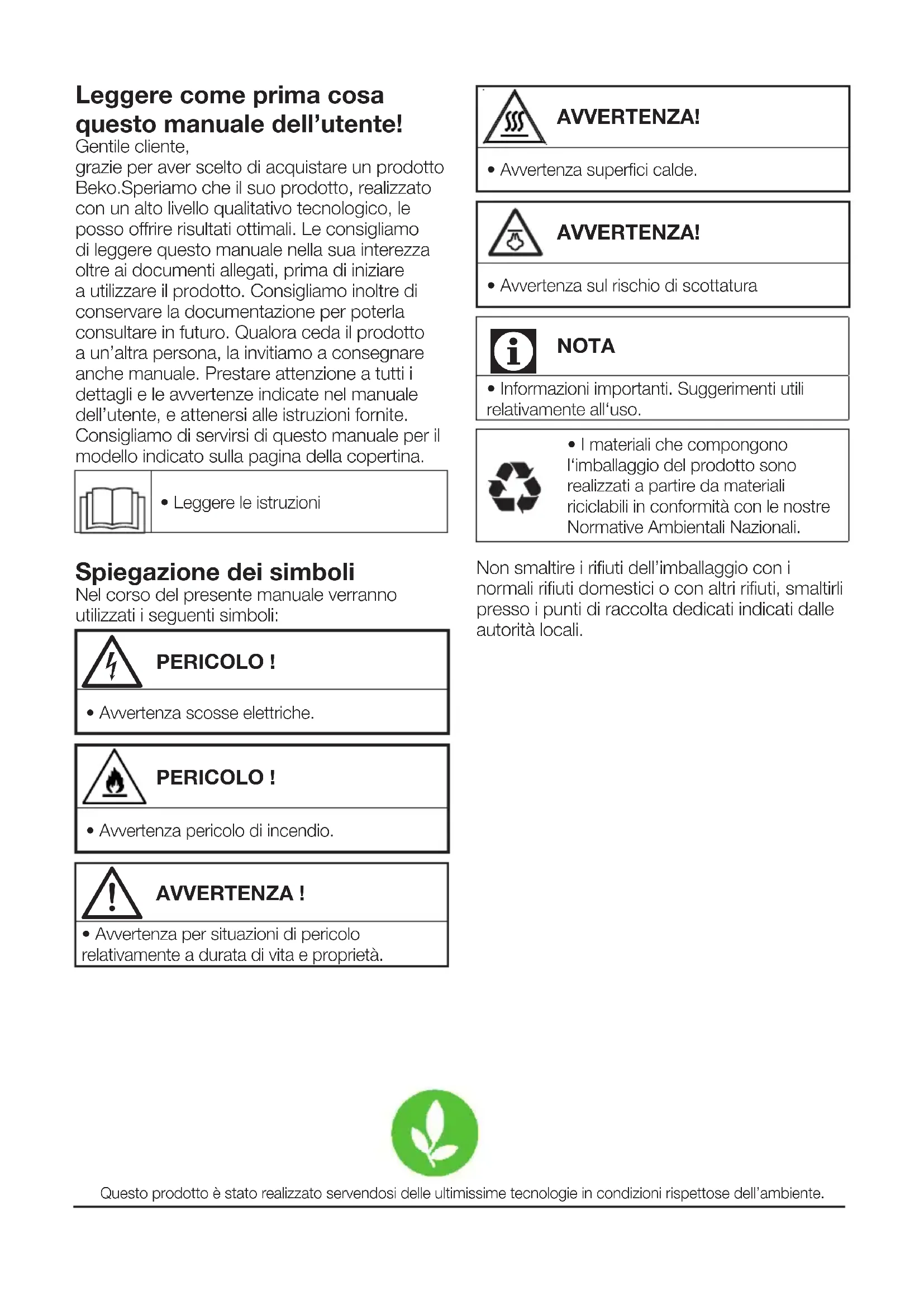 - I materiali che compongono l‘imballaggio del prodotto sono realizzati a partire da materiali riciclabili in conformità con le nostre Normative Ambientali Nazionali. Non smaltire i rifiuti dell’imballaggio con i normali rifiuti domestici o con altri rifiuti, smaltirli presso i punti di raccolta dedicati indicati dalle autorità locali. Questo prodotto è stato realizzato servendosi delle ultimissime tecnologie in condizioni rispettose dell’ambiente.55 Asciugatrice/ Manuale utente 1 Istruzioni importanti per la sicurezza e l’ambiente