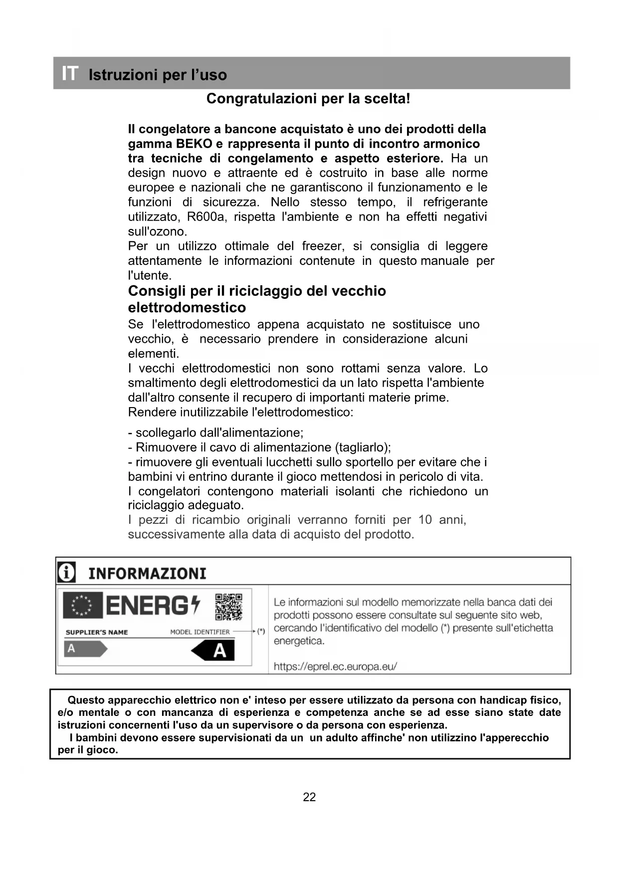 Bedeutung des Symbols „Mülltonne“ Schonen Sie unsere Umwelt, Elektrogeräte gehören nicht in den Hausmüll. Nutzen Sie die für die Entsorgung von Elektrogeräten vorgesehenen Sammelstellen und geben dort Ihre Elektrogeräte ab die Sie nicht mehr benutzen werden. Sie helfen damit die potenziellen Auswirkungen, durch falsche Entsorgung, auf die Umwelt und die menschliche Gesundheit zu vermeiden. Sie leisten damit Ihren Beitrag zur Wiederverwertung, zum Recycling und zu anderen Formen der Verwertung von Elektro- und Elektronik-Altgeräten. Informationen, wo die Geräte zu entsorgen sind, erhalten Sie über Ihre Kommunen oder die Gemeindeverwaltungen. In vielen Ländern der EU ist die Entsorgung von Elektro- und Elektronik-Altgeräten über den Haus- und/oder Restmüll ab 13.8.2005 verboten. In Deutschland ab 23.3.2006.Congratulazioni per la scelta! Il congelatore a bancone acquistato è uno dei prodotti della gamma BEKO e rappresenta il punto di incontro armonico tra tecniche di congelamento e aspetto esteriore. Ha un design nuovo e attraente ed è costruito in base alle norme europee e nazionali che ne garantiscono il funzionamento e le funzioni di sicurezza. Nello stesso tempo, il refrigerante utilizzato, R600a, rispetta l'ambiente e non ha effetti negativi sull'ozono. Per un utilizzo ottimale del freezer, si consiglia di leggere attentamente le informazioni contenute in questo manuale per l'utente. Consigli per il riciclaggio del vecchio elettrodomestico Se l'elettrodomestico appena acquistato ne sostituisce uno vecchio, è necessario prendere in considerazione alcuni elementi. I vecchi elettrodomestici non sono rottami senza valore. Lo smaltimento degli elettrodomestici da un lato rispetta l'ambiente dall'altro consente il recupero di importanti materie prime. Rendere inutilizzabile l'elettrodomestico: - scollegarlo dall'alimentazione; - Rimuovere il cavo di alimentazione (tagliarlo); - rimuovere gli eventuali lucchetti sullo sportello per evitare che i bambini vi entrino durante il gioco mettendosi in pericolo di vita. I congelatori contengono materiali isolanti che richiedono un riciclaggio adeguato. I pezzi di ricambio originali verranno forniti per 10 anni, successivamente alla data di acquisto del prodotto. IT Istruzioni per l’uso