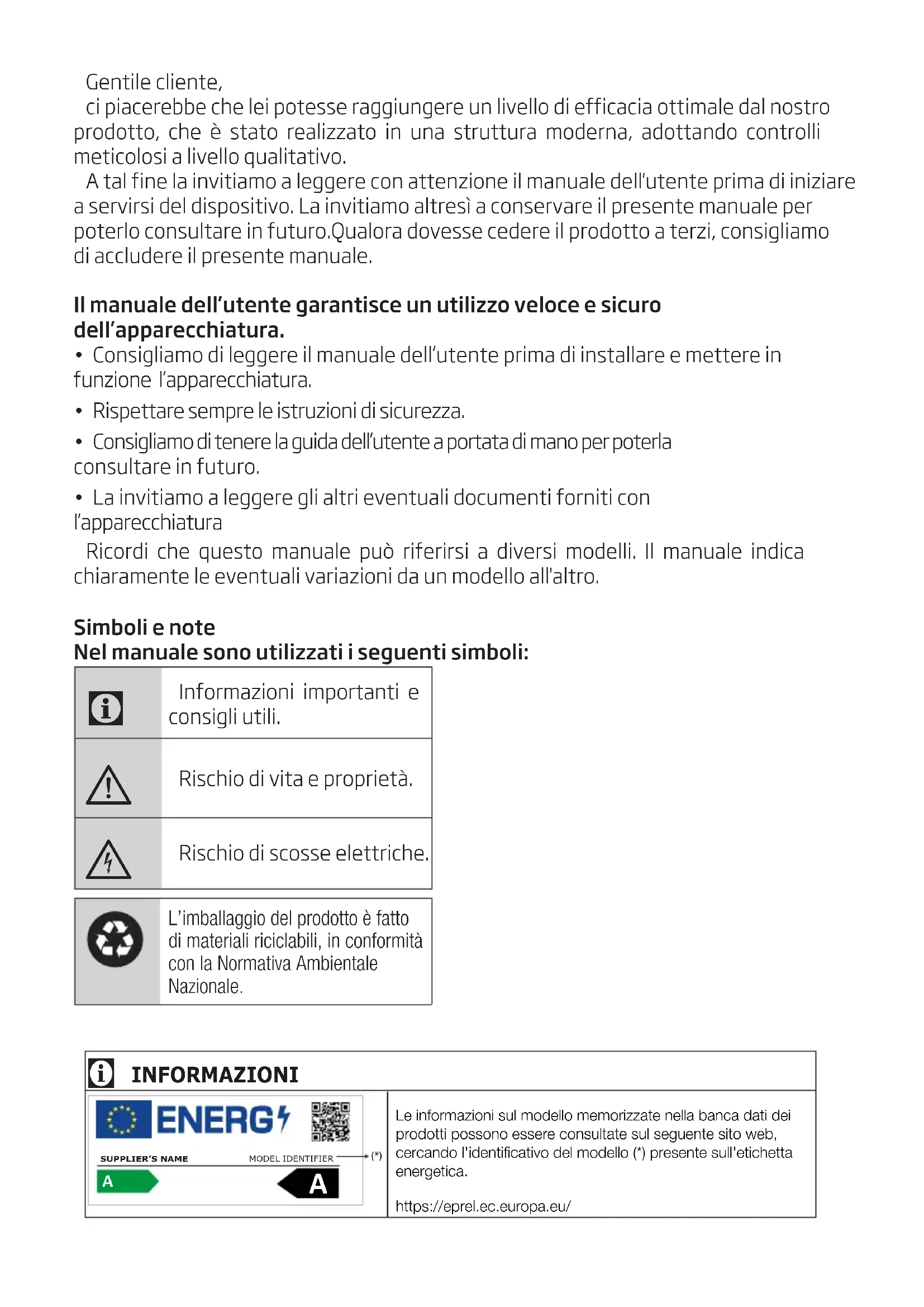 Le informazioni sul modello memorizzate nella banca dati dei prodotti possono essere consultate sul seguente sito web, cercando l'identificativo del modello (*) presente sull'etichetta energetica.https://eprel.ec.europa.eu/