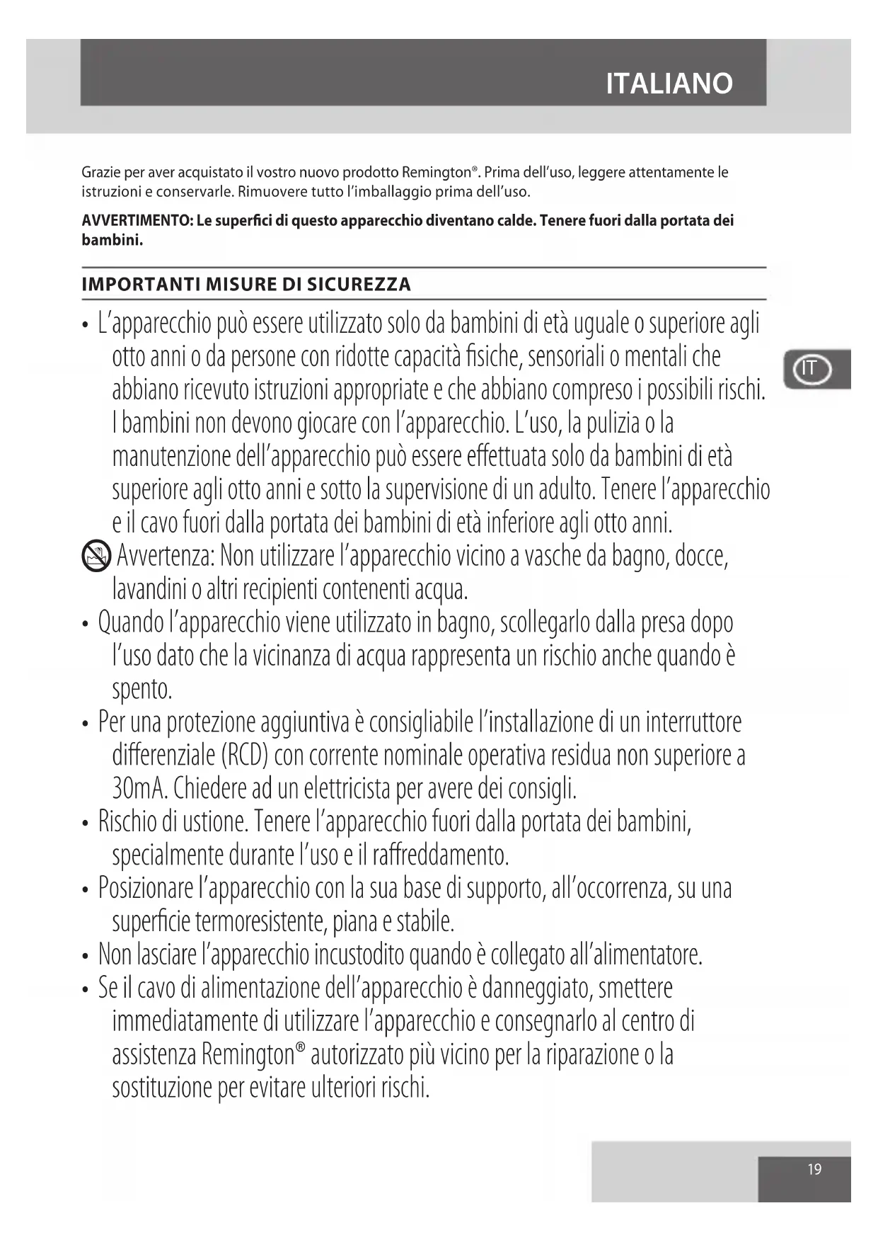 - Se il cavo di alimentazione dell’apparecchio è danneggiato, smettere immediatamente di utilizzare l’apparecchio e consegnarlo al centro di assistenza Remington® autorizzato più vicino per la riparazione o la sostituzione per evitare ulteriori rischi.