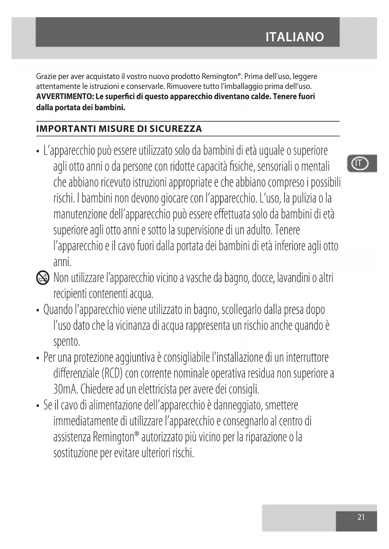 - Se il cavo di alimentazione dell’apparecchio è danneggiato, smettere immediatamente di utilizzare l’apparecchio e consegnarlo al centro di assistenza Remington® autorizzato più vicino per la riparazione o la sostituzione per evitare ulteriori rischi.