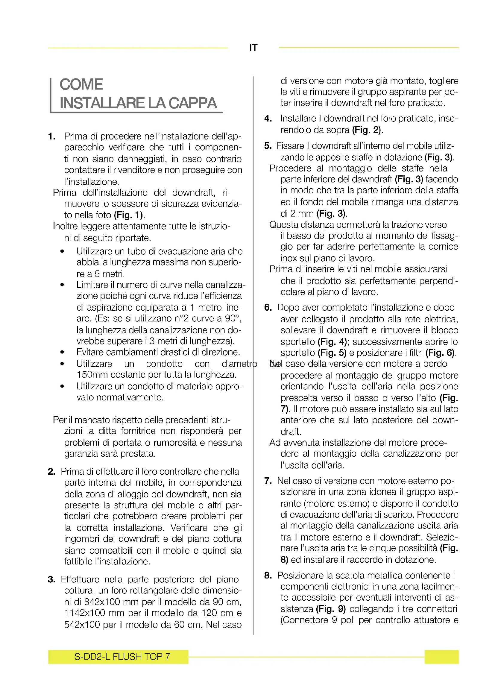 - Durante la movimentazione del Downdraft non posizionare le mani nel raggio di azione del carrello estraibile. Nell’intento costante di migliorare i nostri prodot- ti, ci riserviamo il diritto di apportare alle loro ca- ratteristiche tecniche, funzionali o estetiche tutte le modifiche derivanti dalla loro evoluzione. Nel caso di versione esternal motor, per il nor- male funzionamento del downdraft è necessario utilizzare un gruppo aspirante (motore esterno) della stessa casa produttrice. L’aria raccolta non deve essere convogliata in un condotto usato per lo scarico di fumi di apparec- chi alimentati con energia diversa da quella elet- trica (impianti di riscaldamento centralizzati ecc:). Per lo scarico dell’aria da evacuare rispettare le prescrizioni delle autorità competenti. AVVERTENZA Conservare le presenti istruzioni d’uso con l’apparecchio. Se l’apparecchio dovesse essere venduto o ceduto ad altri, assicurar- si che esso sia accompagnato dalle presenti istruzioni. Vi ringraziamo di prendere nota di questi consigli prima di installare e utilizzare l’apparecchio. Essi sono stati redatti per la sicurezza personale vostra e altrui.S-DD2-L FLUSH TOP 5
