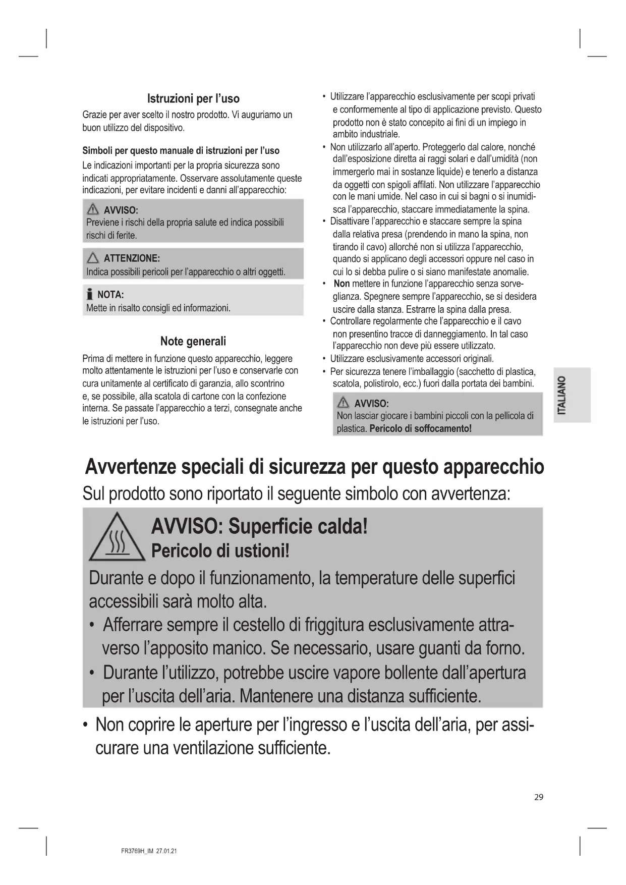 - Rimessare sempre l’apparecchio in un luogo asciutto e ben ventilato al di fuori della portata dei bambini. Rimozione guasti Se si verifica un problema, di solito è un piccolo inconveniente. Prima di contattare il nostro servizio, tenere conto delle seguenti informazioni: Problema Possibile causa Rimedio L’apparecchio è senza funzione. L’apparecchio non viene alimentato. Controllare la presa con un’altro apparecchio. Inserire la spina correttamente. Controllare l’interruttore di circuito principale. Non si è impostato il tempo di cottura. Selezionare il tempo di cottura desiderato. Il cibo non è cotto alla fine. Il cestello di friggitura è stato riempito eccessivamente. Ridurre la quantità di cibo. Quantità più piccole vengono cotte uniformemente. La temperatura è impostata troppo bassa. Impostare la temperatura più alta con il controllo della temperatura (vedere la “Tabella dei tempi di cottura”). Il tempo di cottura impostato è troppo basso. Utilizzare il timer per aumentare il tempo di cottura (vedere la “Tabella dei tempi di cottura”). Il cibo è cotto in modo non uniforme. Quando il cibo si sovrappone al resto, Il flusso dell’aria è inadeguato. Il cibo deve essere smosso dopo metà cottura. Il cibo non è croccante. I cibi usati devono essere adatti alla friggi- trice convenzionale. Usare cibo pronto per il forno e spargere un filo d’olio. Esce fumo dal dispositivo. Si stanno cuocendo cibi molto grassi. Il grasso che schizza dentro l’unità potrebbe far emettere fumi. Fornire una ventilazione adeguata. Nel cestello di friggitura ci sono ancora resi- dui di grassi dall’utilizzo precedente. Pulire il cestello di friggitura dopo ogni uso come descritto nel capitolo “Pulizia”.FR3769H_IM 27.01.21
