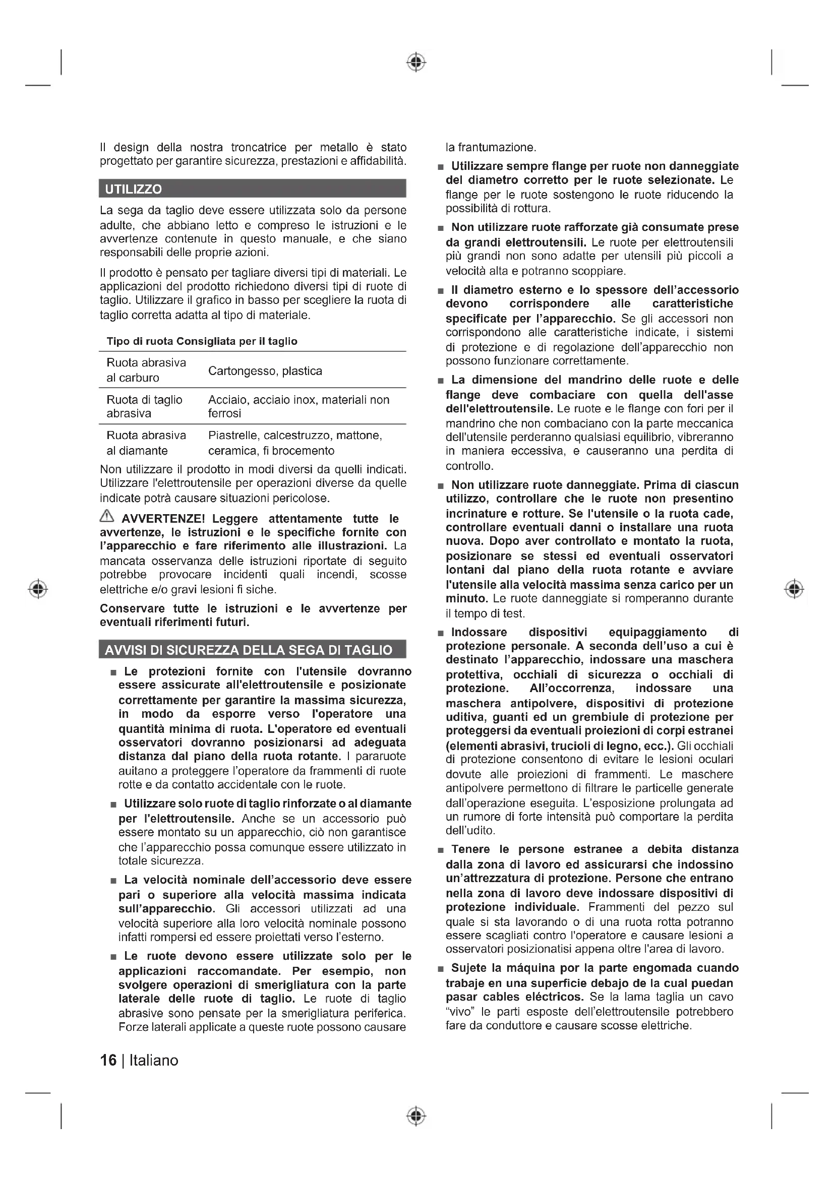 Nota Las piezas o accesorios se venden por separado16 | Italiano Il design della nostra troncatrice per metallo è stato progettato per garantire sicurezza, prestazioni e affi dabilità. UTILIZZO La sega da taglio deve essere utilizzata solo da persone adulte, che abbiano letto e compreso le istruzioni e le avvertenze contenute in questo manuale, e che siano responsabili delle proprie azioni. Il prodotto è pensato per tagliare diversi tipi di materiali. Le applicazioni del prodotto richiedono diversi tipi di ruote di taglio. Utilizzare il grafi co in basso per scegliere la ruota di taglio corretta adatta al tipo di materiale. Tipo di ruota Consigliata per il taglio Ruota abrasiva al carburo Cartongesso, plastica Ruota di taglio abrasiva Acciaio, acciaio inox, materiali non ferrosi Ruota abrasiva al diamante Piastrelle, calcestruzzo, mattone, ceramica, fi brocemento Non utilizzare il prodotto in modi diversi da quelli indicati. Utilizzare l'elettroutensile per operazioni diverse da quelle indicate potrà causare situazioni pericolose. AVVERTENZE! Leggere attentamente tutte le avvertenze, le istruzioni e le specifiche fornite con l’apparecchio e fare riferimento alle illustrazioni. La mancata osservanza delle istruzioni riportate di seguito potrebbe provocare incidenti quali incendi, scosse elettriche e/o gravi lesioni fi siche. Conservare tutte le istruzioni e le avvertenze per eventuali riferimenti futuri. AVVISI DI SICUREZZA DELLA SEGA DI TAGLIO ■ Le protezioni fornite con l'utensile dovranno essere assicurate all'elettroutensile e posizionate correttamente per garantire la massima sicurezza, in modo da esporre verso l'operatore una quantità minima di ruota. L'operatore ed eventuali osservatori dovranno posizionarsi ad adeguata distanza dal piano della ruota rotante. I pararuote auitano a proteggere l’operatore da frammenti di ruote rotte e da contatto accidentale con le ruote. ■ Utilizzare solo ruote di taglio rinforzate o al diamante per l'elettroutensile. Anche se un accessorio può essere montato su un apparecchio, ciò non garantisce che l’apparecchio possa comunque essere utilizzato in totale sicurezza. ■ La velocità nominale dell’accessorio deve essere pari o superiore alla velocità massima indicata sull’apparecchio. Gli accessori utilizzati ad una velocità superiore alla loro velocità nominale possono infatti rompersi ed essere proiettati verso l’esterno. ■ Le ruote devono essere utilizzate solo per le applicazioni raccomandate. Per esempio, non svolgere operazioni di smerigliatura con la parte laterale delle ruote di taglio. Le ruote di taglio abrasive sono pensate per la smerigliatura periferica. Forze laterali applicate a queste ruote possono causare la frantumazione. ■ Utilizzare sempre flange per ruote non danneggiate del diametro corretto per le ruote selezionate. Le flange per le ruote sostengono le ruote riducendo la possibilità di rottura. ■ Non utilizzare ruote rafforzate già consumate prese da grandi elettroutensili. Le ruote per elettroutensili più grandi non sono adatte per utensili più piccoli a velocità alta e potranno scoppiare. ■ Il diametro esterno e lo spessore dell’accessorio devono corrispondere alle caratteristiche specificate per l’apparecchio. Se gli accessori non corrispondono alle caratteristiche indicate, i sistemi di protezione e di regolazione dell’apparecchio non possono funzionare correttamente. ■ La dimensione del mandrino delle ruote e delle flange deve combaciare con quella dell'asse dell'elettroutensile. Le ruote e le flange con fori per il mandrino che non combaciano con la parte meccanica dell'utensile perderanno qualsiasi equilibrio, vibreranno in maniera eccessiva, e causeranno una perdita di controllo. ■ Non utilizzare ruote danneggiate. Prima di ciascun utilizzo, controllare che le ruote non presentino incrinature e rotture. Se l'utensile o la ruota cade, controllare eventuali danni o installare una ruota nuova. Dopo aver controllato e montato la ruota, posizionare se stessi ed eventuali osservatori lontani dal piano della ruota rotante e avviare l'utensile alla velocità massima senza carico per un minuto. Le ruote danneggiate si romperanno durante il tempo di test. ■ Indossare dispositivi equipaggiamento di protezione personale. A seconda dell’uso a cui è destinato l’apparecchio, indossare una maschera protettiva, occhiali di sicurezza o occhiali di protezione. All’occorrenza, indossare una maschera antipolvere, dispositivi di protezione uditiva, guanti ed un grembiule di protezione per proteggersi da eventuali proiezioni di corpi estranei (elementi abrasivi, trucioli di legno, ecc.). Gli occhiali di protezione consentono di evitare le lesioni oculari dovute alle proiezioni di frammenti. Le maschere antipolvere permettono di filtrare le particelle generate dall’operazione eseguita. L’esposizione prolungata ad un rumore di forte intensità può comportare la perdita dell’udito. ■ Tenere le persone estranee a debita distanza dalla zona di lavoro ed assicurarsi che indossino un’attrezzatura di protezione. Persone che entrano nella zona di lavoro deve indossare dispositivi di protezione individuale. Frammenti del pezzo sul quale si sta lavorando o di una ruota rotta potranno essere scagliati contro l'operatore e causare lesioni a osservatori posizionatisi appena oltre l'area di lavoro. ■ Sujete la máquina por la parte engomada cuando trabaje en una superficie debajo de la cual puedan pasar cables eléctricos. Se la lama taglia un cavo “vivo” le parti esposte dell’elettroutensile potrebbero fare da conduttore e causare scosse elettriche.17 Italiano |