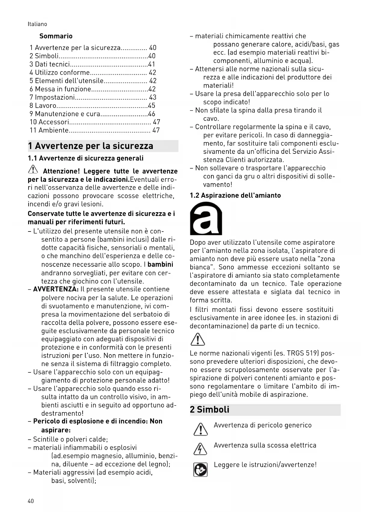 Dopo aver utilizzato l'utensile come aspiratore per l'amianto nella zona isolata, l'aspiratore di amianto non deve più essere usato nella "zona bianca". Sono ammesse eccezioni soltanto se l'aspiratore di amianto sia stato completamente decontaminato da un tecnico. Tale operazione deve essere attestata e siglata dal tecnico in forma scritta. I filtri montati fissi devono essere sostituiti esclusivamente in aree idonee (es. in stazioni di decontaminazione) da parte di un tecnico. Le norme nazionali vigenti (es. TRGS 519) pos sono prevedere ulteriori disposizioni, che devo no essere scrupolosamente osservate per l'a spirazione di polveri contenenti amianto e pos sono regolamentare o limitare l'ambito di im piego dell'unità mobile di aspirazione. 2 Simboli Avvertenza di pericolo generico Avvertenza sulla scossa elettrica Leggere le istruzioni/avvertenze! Italiano 40Indossare una mascherina! Non fa parte dei rifiuti comunali. Attenzione contiene amianto! Presa con interruttore automatico WARNUNG ≤ 0,1 mg/m