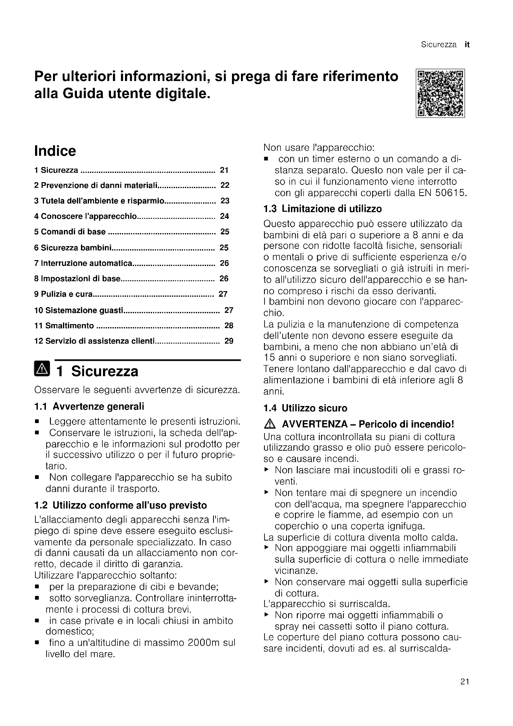 - 12 Servizio di assistenza clienti 1 Sicurezza Osservare le seguenti avvertenze di sicurezza. 1.1 Avvertenze generali ¡ Leggere attentamente le presenti istruzioni. ¡ Conservare le istruzioni, la scheda dell'ap- parecchio e le informazioni sul prodotto per il successivo utilizzo o per il futuro proprie- tario. ¡ Non collegare l'apparecchio se ha subito danni durante il trasporto. 1.2 Utilizzo conforme all'uso previsto L'allacciamento degli apparecchi senza l'im- piego di spine deve essere eseguito esclusi- vamente da personale specializzato. In caso di danni causati da un allacciamento non cor- retto, decade il diritto di garanzia. Utilizzare l'apparecchio soltanto: ¡ per la preparazione di cibi e bevande; ¡ sotto sorveglianza. Controllare ininterrotta- mente i processi di cottura brevi. ¡ in case private e in locali chiusi in ambito domestico; ¡ fino a un'altitudine di massimo 2000m sul livello del mare. Non usare l'apparecchio: ¡ con un timer esterno o un comando a di- stanza separato. Questo non vale per il ca- so in cui il funzionamento viene interrotto con gli apparecchi coperti dalla EN50615. 1.3 Limitazione di utilizzo Questo apparecchio può essere utilizzato da bambini di età pari o superiore a 8 anni e da persone con ridotte facoltà fisiche, sensoriali o mentali o prive di sufficiente esperienza e/o conoscenza se sorvegliati o già istruiti in meri- to all'utilizzo sicuro dell'apparecchio e se han- no compreso i rischi da esso derivanti. I bambini non devono giocare con l'apparec- chio. La pulizia e la manutenzione di competenza dell’utente non devono essere eseguite da bambini, a meno che non abbiano un’età di 15 anni o superiore e non siano sorvegliati. Tenere lontano dall'apparecchio e dal cavo di alimentazione i bambini di età inferiore agli 8 anni. 1.4 Utilizzo sicuro AVVERTENZA‒Pericolo di incendio! Una cottura incontrollata su piani di cottura utilizzando grasso e olio può essere pericolo- so e causare incendi. p. 29