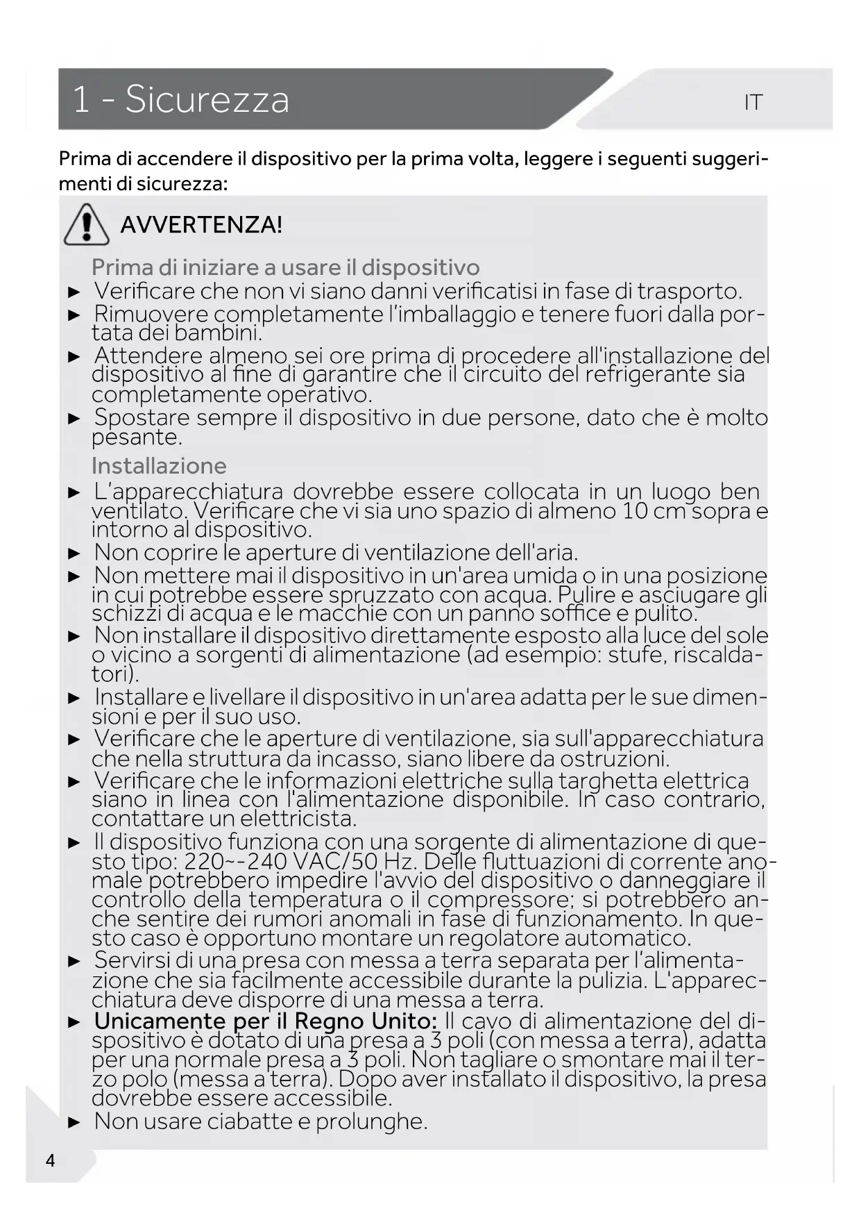 AVVERTENZA! Prima di iniziare a usare il dispositivo ▶ Vericare che non vi siano danni vericatisi in fase di trasporto. ▶ Rimuovere completamente l’imballaggio e tenere fuori dalla por- tata dei bambini. ▶ Attendere almeno sei ore prima di procedere all'installazione del dispositivo al ne di garantire che il circuito del refrigerante sia completamente operativo. ▶ Spostare sempre il dispositivo in due persone, dato che è molto pesante. Installazione ▶ L’apparecchiatura dovrebbe essere collocata in un luogo ben ventilato. Vericare che vi sia uno spazio di almeno 10 cm sopra e intorno al dispositivo. ▶ Non coprire le aperture di ventilazione dell'aria. ▶ Non mettere mai il dispositivo in un'area umida o in una posizione in cui potrebbe essere spruzzato con acqua. Pulire e asciugare gli schizzi di acqua e le macchie con un panno soce e pulito. ▶ Non installare il dispositivo direttamente esposto alla luce del sole o vicino a sorgenti di alimentazione (ad esempio: stufe, riscalda- tori). ▶ Installare e livellare il dispositivo in un'area adatta per le sue dimen- sioni e per il suo uso. ▶ Vericare che le aperture di ventilazione, sia sull'apparecchiatura che nella struttura da incasso, siano libere da ostruzioni. ▶ Vericare che le informazioni elettriche sulla targhetta elettrica siano in linea con l'alimentazione disponibile. In caso contrario, contattare un elettricista. ▶ Il dispositivo funziona con una sorgente di alimentazione di que- sto tipo: 220~-240 VAC/50 Hz. Delle uttuazioni di corrente ano- male potrebbero impedire l'avvio del dispositivo o danneggiare il controllo della temperatura o il compressore; si potrebbero an- che sentire dei rumori anomali in fase di funzionamento. In que- sto caso è opportuno montare un regolatore automatico. ▶ Servirsi di una presa con messa a terra separata per l’alimenta- zione che sia facilmente accessibile durante la pulizia. L'apparec- chiatura deve disporre di una messa a terra. ▶ Unicamente per il Regno Unito: Il cavo di alimentazione del di- spositivo è dotato di una presa a 3 poli (con messa a terra), adatta per una normale presa a 3 poli. Non tagliare o smontare mai il ter- zo polo (messa a terra). Dopo aver installato il dispositivo, la presa dovrebbe essere accessibile. ▶ Non usare ciabatte e prolunghe.