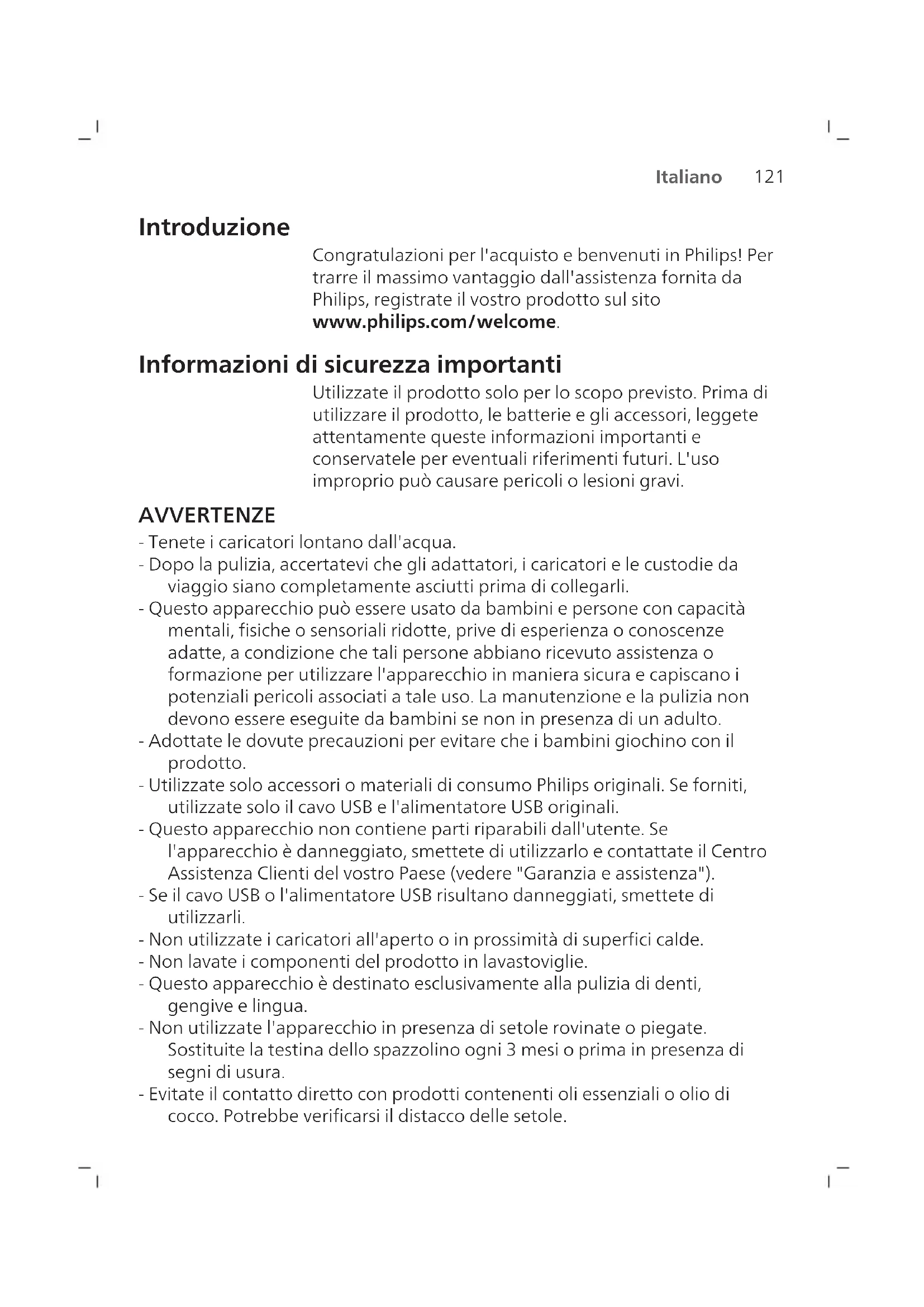 Italiano Introduzione Congratulazioni per l'acquisto e benvenuti in Philips! Per trarre il massimo vantaggio dall'assistenza fornita da Philips, registrate il vostro prodotto sul sito www.philips.com/welcome. Informazioni di sicurezza importanti Utilizzate il prodotto solo per lo scopo previsto. Prima di utilizzare il prodotto, le batterie e gli accessori, leggete attentamente queste informazioni importanti e conservatele per eventuali riferimenti futuri. L'uso improprio può causare pericoli o lesioni gravi. AVVERTENZE - Tenete i caricatori lontano dall'acqua. - Dopo la pulizia, accertatevi che gli adattatori, i caricatori e le custodie da viaggio siano completamente asciutti prima di collegarli. - Questo apparecchio può essere usato da bambini e persone con capacità mentali, fisiche o sensoriali ridotte, prive di esperienza o conoscenze adatte, a condizione che tali persone abbiano ricevuto assistenza o formazione per utilizzare l'apparecchio in maniera sicura e capiscano i potenziali pericoli associati a tale uso. La manutenzione e la pulizia non devono essere eseguite da bambini se non in presenza di un adulto. - Adottate le dovute precauzioni per evitare che i bambini giochino con il prodotto. - Utilizzate solo accessori o materiali di consumo Philips originali. Se forniti, utilizzate solo il cavo USB e l'alimentatore USB originali. - Questo apparecchio non contiene parti riparabili dall'utente. Se l'apparecchio è danneggiato, smettete di utilizzarlo e contattate il Centro Assistenza Clienti del vostro Paese (vedere "Garanzia e assistenza"). - Se il cavo USB o l'alimentatore USB risultano danneggiati, smettete di utilizzarli. - Non utilizzate i caricatori all'aperto o in prossimità di superfici calde. - Non lavate i componenti del prodotto in lavastoviglie. - Questo apparecchio è destinato esclusivamente alla pulizia di denti, gengive e lingua. - Non utilizzate l'apparecchio in presenza di setole rovinate o piegate. Sostituite la testina dello spazzolino ogni3 mesi o prima in presenza di segni di usura. - Evitate il contatto diretto con prodotti contenenti oli essenziali o olio di cocco. Potrebbe verificarsi il distacco delle setole.122 Italiano