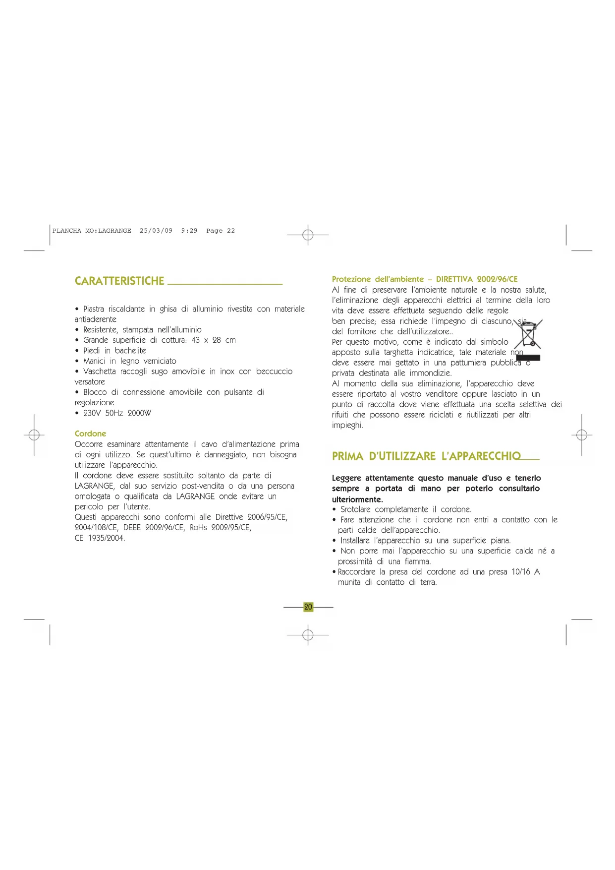 - 230V 50Hz 2000W Cordone Occorre esaminare attentamente il cavo d’alimentazione prima di ogni utilizzo. Se quest’ultimo è danneggiato, non bisogna utilizzare l’apparecchio. Il cordone deve essere sostituito soltanto da parte di LAGRANGE, dal suo servizio post-vendita o da una persona omologata o qualificata da LAGRANGE onde evitare un pericolo per l’utente. Questi apparecchi sono conformi alle Direttive 2006/95/CE, 2004/108/CE, DEEE 2002/96/CE, RoHs 2002/95/CE, CE 1935/2004. Protezione dell’ambiente – DIRETTIVA 2002/96/CE Al fine di preservare l’ambiente naturale e la nostra salute, l’eliminazione degli apparecchi elettrici al termine della loro vita deve essere effettuata seguendo delle regole ben precise; essa richiede l’impegno di ciascuno, sia del fornitore che dell’utilizzatore.. Per questo motivo, come è indicato dal simbolo apposto sulla targhetta indicatrice, tale materiale non deve essere mai gettato in una pattumiera pubblica o privata destinata alle immondizie. Al momento della sua eliminazione, l’apparecchio deve essere riportato al vostro venditore oppure lasciato in un punto di raccolta dove viene effettuata una scelta selettiva dei rifuiti che possono essere riciclati e riutilizzati per altri impieghi.